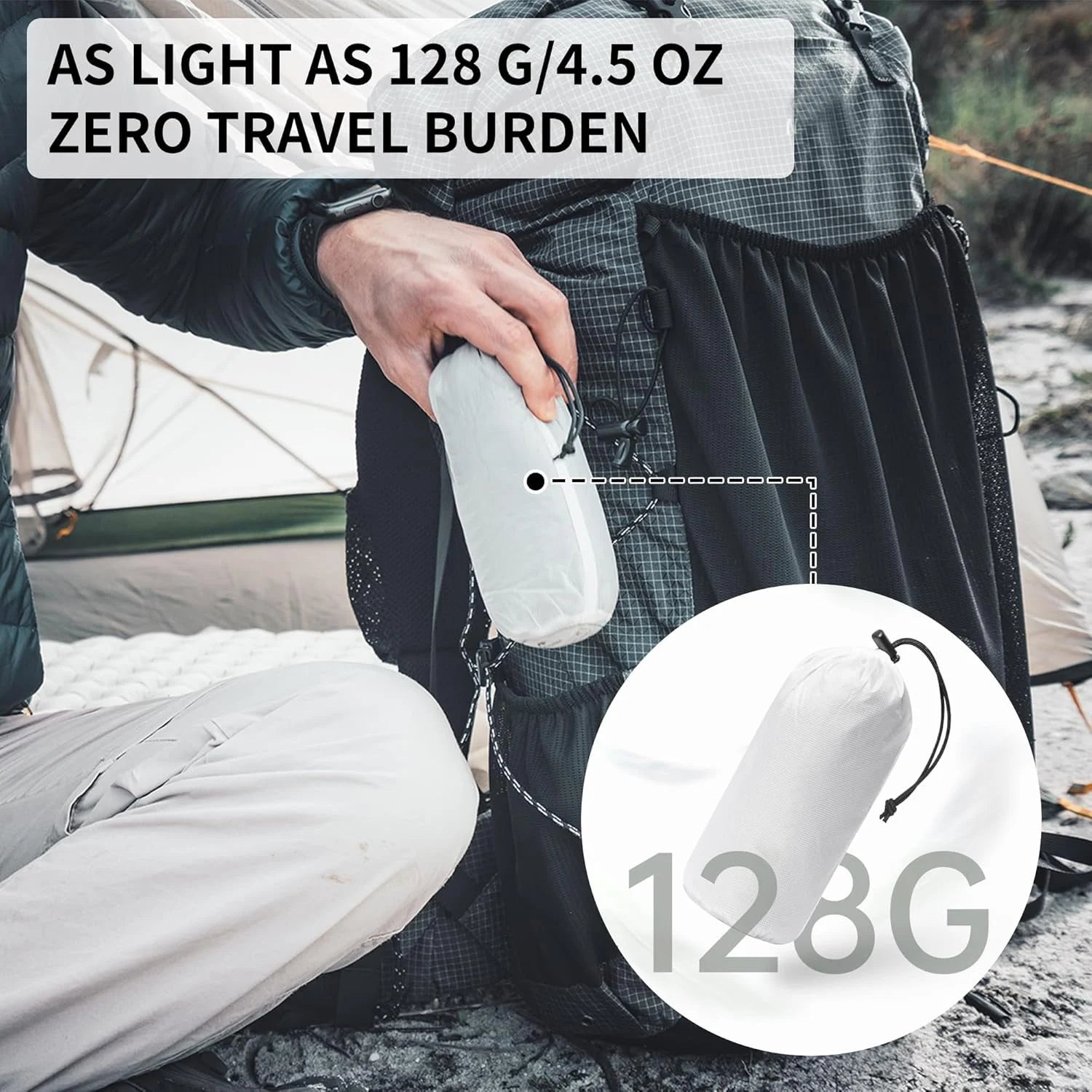 Storage size (storage bag included)2.4"L x 5.9"W,128g/4.51oz,Packs very small, sleeping sack which took up minimal space in your side bag. it was very easy to roll up and put back in its travel bag. Very light to carry which makes it nice for trekking.
