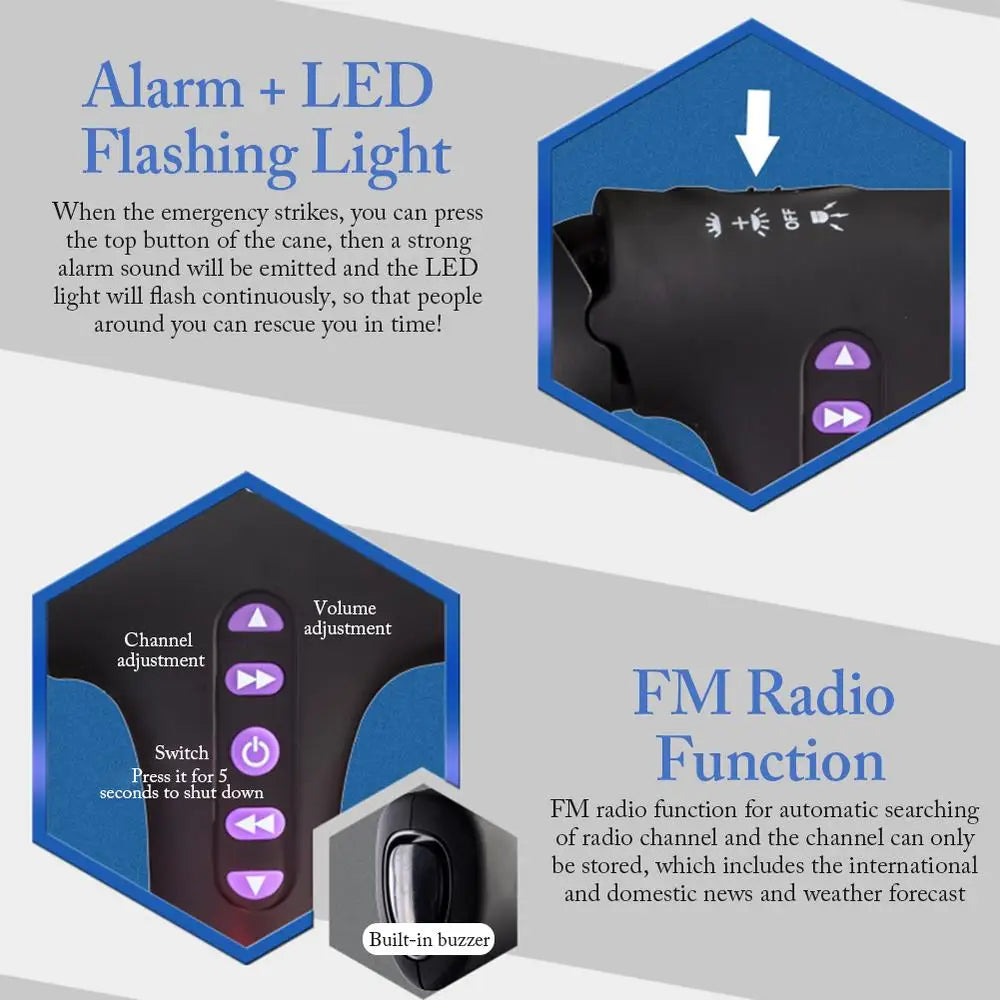 Powerful Function: The cane can automatically search the radio channels and can only store them for you, which include international and domestic news, weather forecast, the cane features the strap, and it is easy to carry and . Old people can use the cane when they are skiing when traveling or hiking, the cane can prevent loss when they are going out, and it can be connected to power charging. A charger is attached to extend the crutches using the radio, alarm, and LED lighting time. The cane is easy to fold, easy to store or travel, and it features the convenient wrist strap. The cane is the neutral item for unisex, which is suitable for luggage, backpacks, suitcases, etc. The cane features the comfortable foam handle for arthritis patients. Be careful when using canes on wet floors, tiles and other smooth surfaces. The cane features the ultra-wide quadrilateral base for self-balancing and sturdy 4 safety handles.