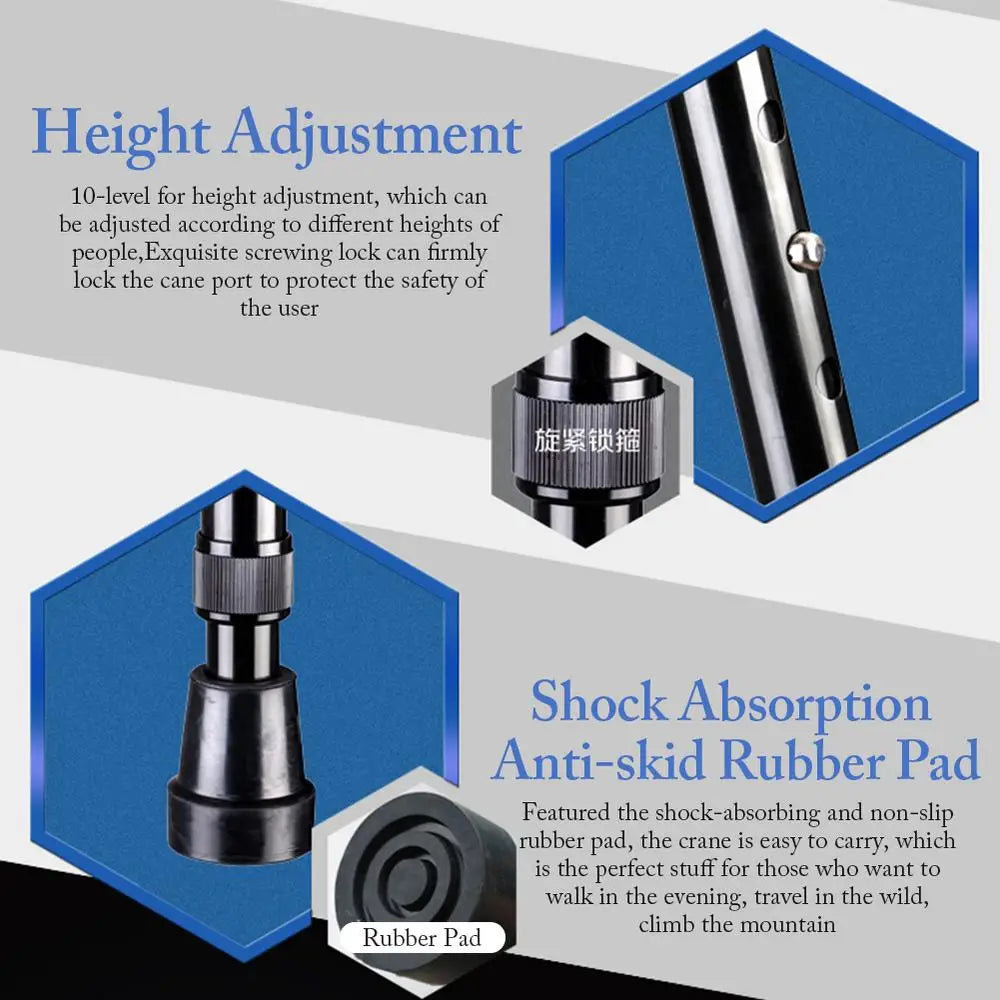 Adjustable Height: The cane measures about minimum height of 73cm/28in(about), maximum 96cm/38in(about). The cane features 10- setting for height adjustment, which can be adjusted according to different heights. It features the exquisite tightening lock, firmly lock the crutches interface, and it is multi-functional and easy to fold, easy to store, and extended to the locked position. the safety of users. The cane features the non-slip safety designed with shock-absorbing and non-slip rubber mats, the cane is easy to carry, and the elderly can use the cane to walk in the evening and travel in the wild, climbing is the best choice! The portable adjustable cane LED lights directly to the front 20 meters and can be adjusted to different illumination angles. The folding design makes the cane the lightest cane in the market.