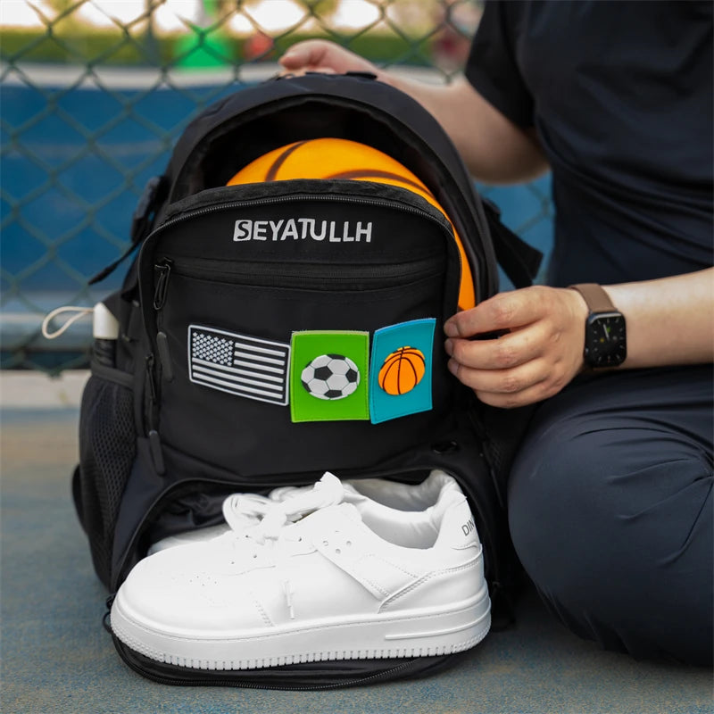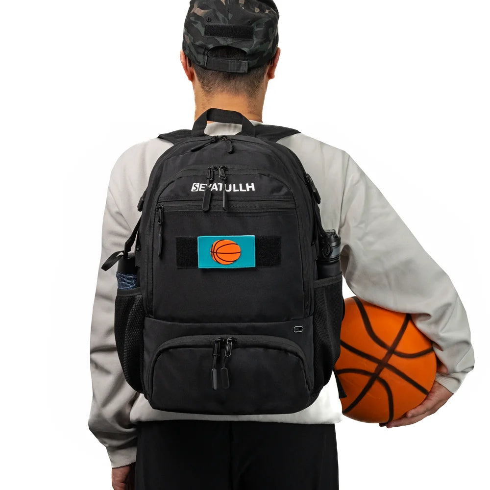 30L CAPACITY FOR DAILY NEEDS : The dimensions of SEYATULLH basketball bag backpack for men women boys girls are 12.6"(L)x8.27"(W)x17.72"(H). It has 1x ball compartment, 1x shoes compartment, 1x main compartment, 1x small zipper pocket and 2x mesh pockets. The separate design of different compartments can store your items in partitions to make them more organized and clean.