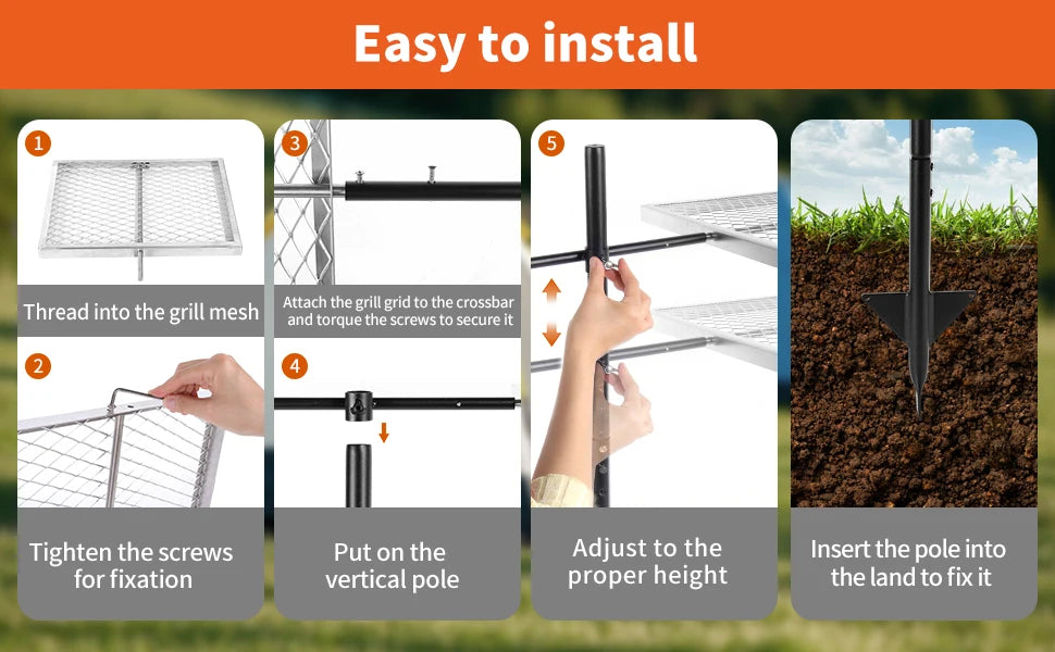 Easy Assembly - With the handy guide, you can assemble this fire pit cooking grate in minutes!This firepit grill is compatible with most soils – install it at the beach, a campsite, or your backyard!With this outdoor cooking equipment, just stick, set, sizzle, & serve!