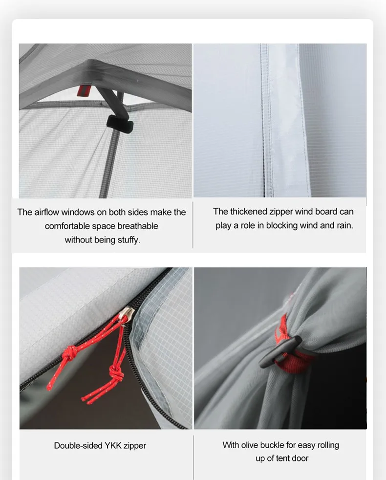 Packing list:Flysheet*1,inner tent*1,storage bag*1,wind rope*6, pole*1,ground nail*12,the pole emergency set roid*1,spare hook*1,heat repair patch*2