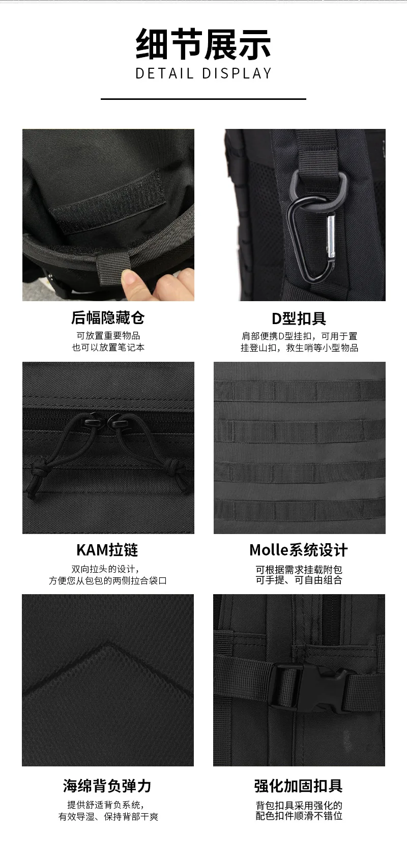 MOLLE Webbing System: Features external MOLLE straps for attaching additional gear (e.g., water bottle holders, tool pouches), providing expandable storage options.