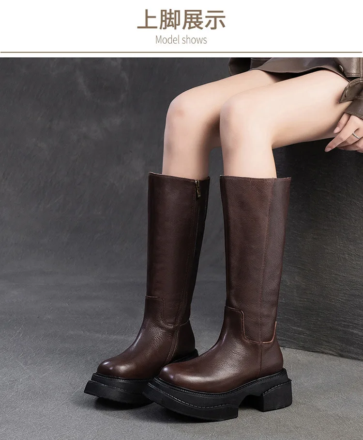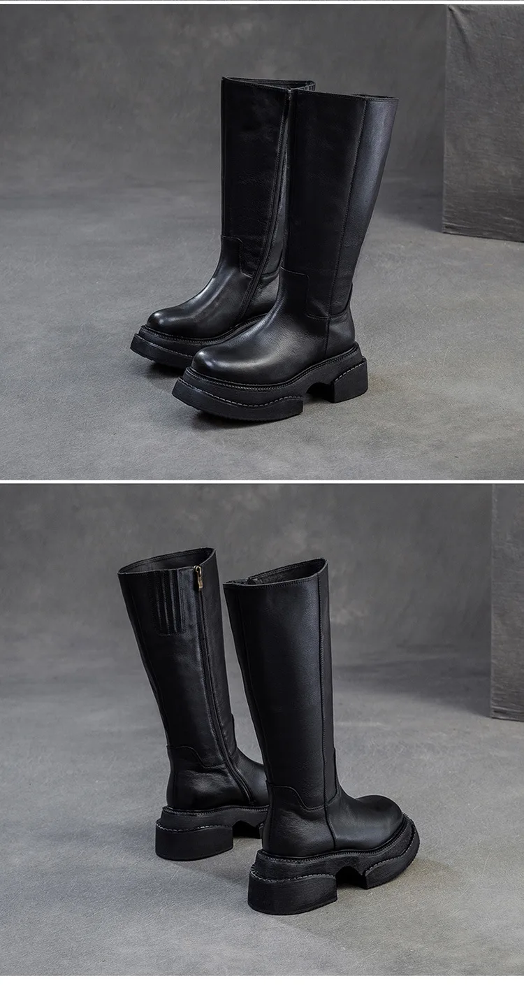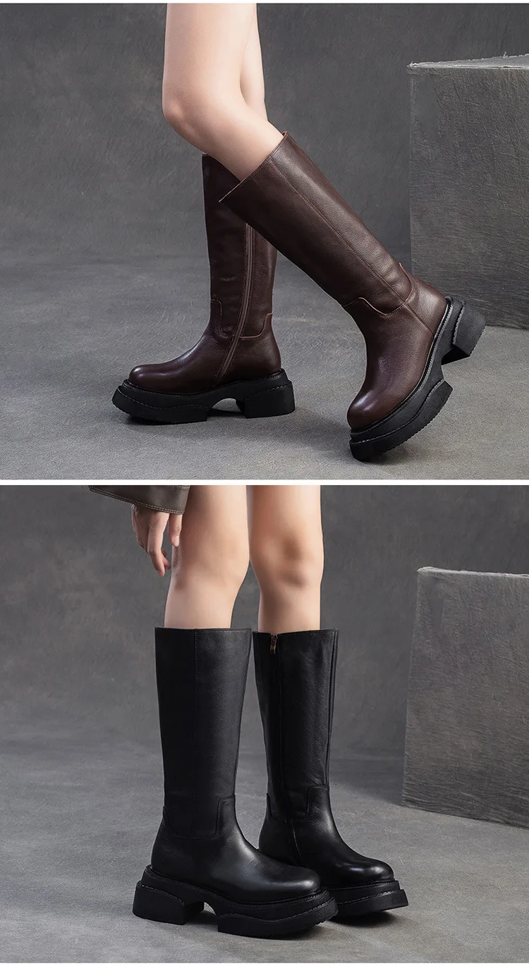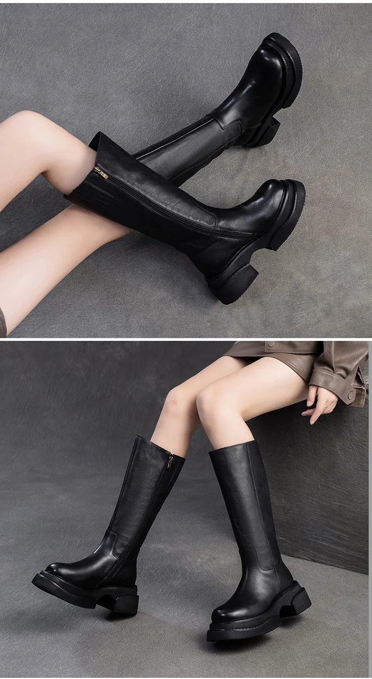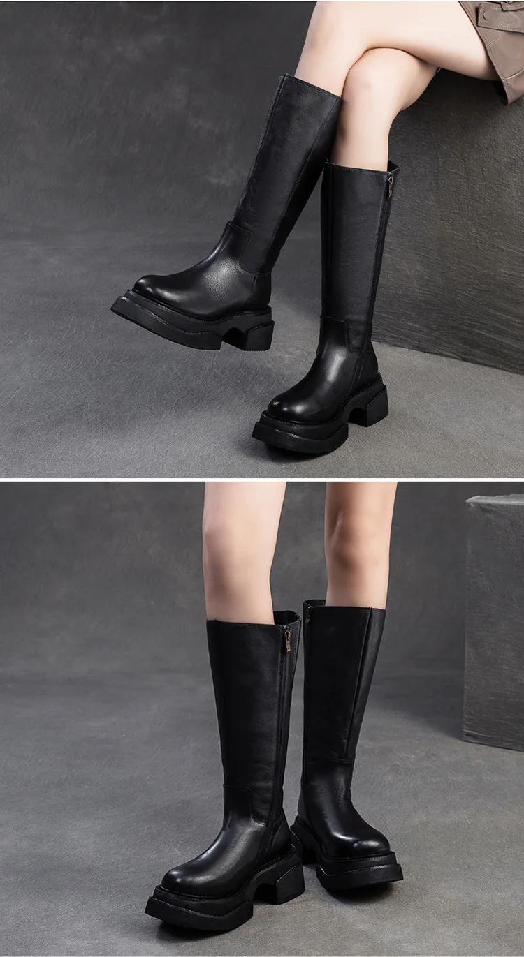 6.5cm Cow Genuine Leather Women Ankle Knee Motorcycle Booties Boots Chunky Heels Platform Wedge Shoes Chimney High ZIP Spring