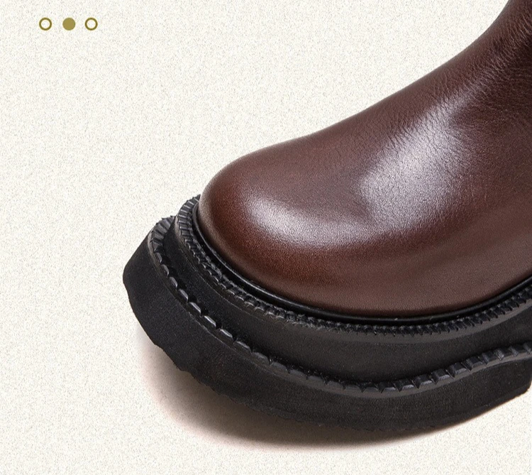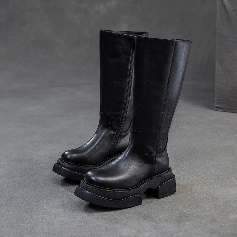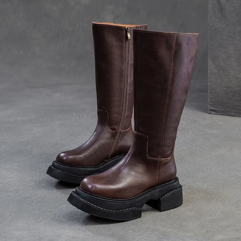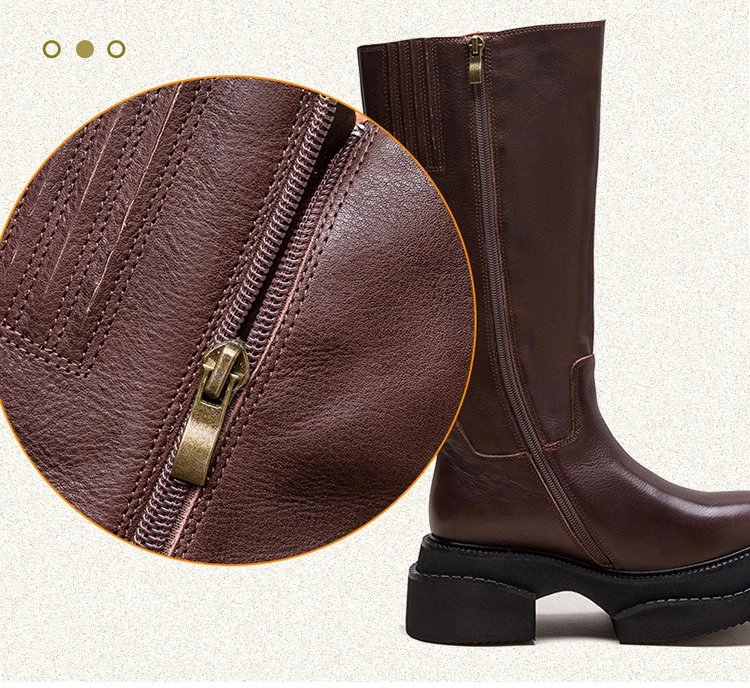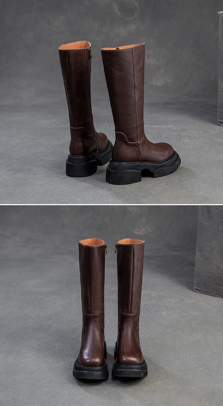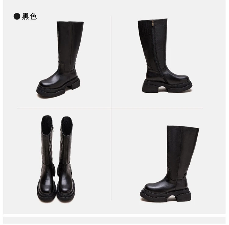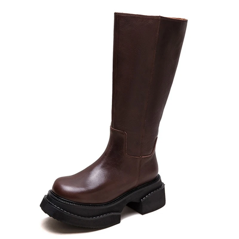 6.5cm Cow Genuine Leather Women Ankle Knee Motorcycle Booties Boots Chunky Heels Platform Wedge Shoes Chimney High ZIP Spring