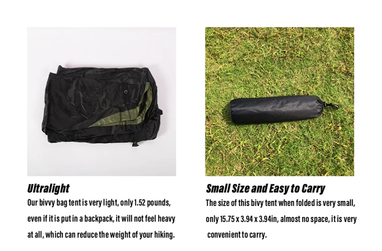 This ultralight bivvy bag tent perfect for solo adventures. The weight is only 800g. Packed Size: 15.75 x 3.94 x 3.94in. Easy to hold into your backpack, extremely handy and easy to transport.
