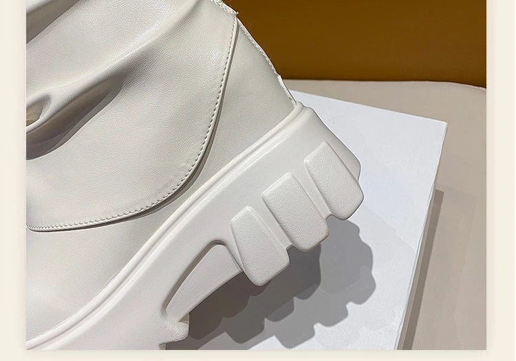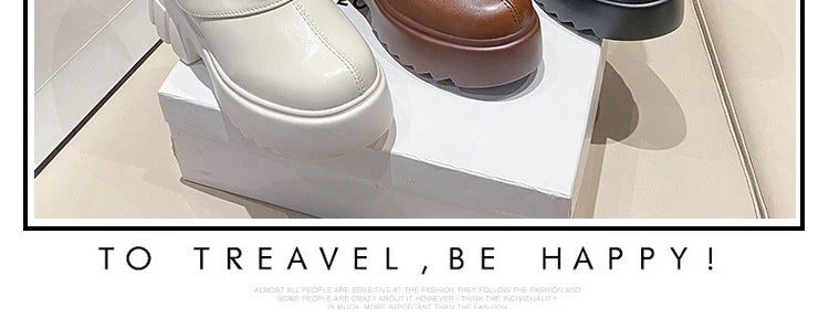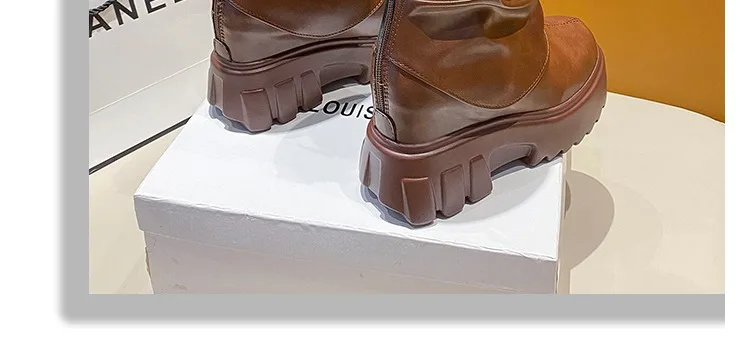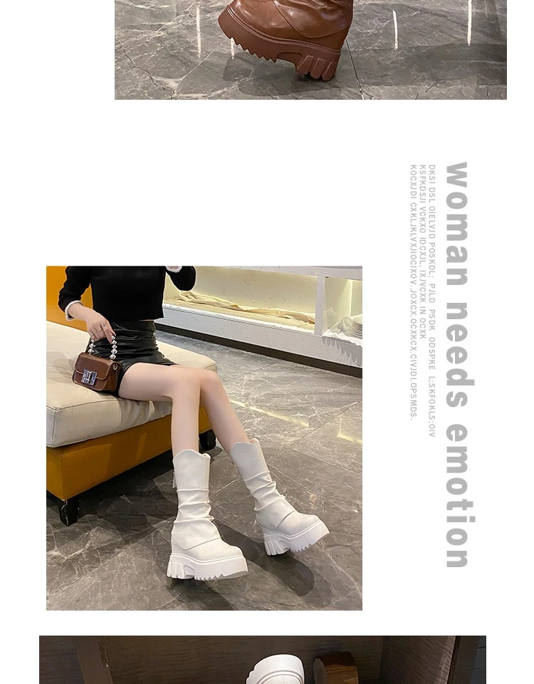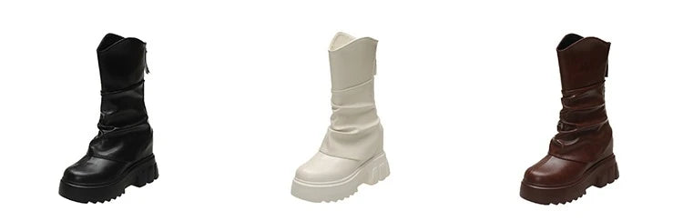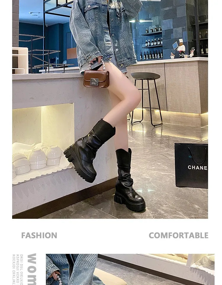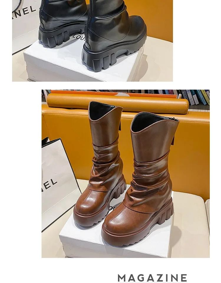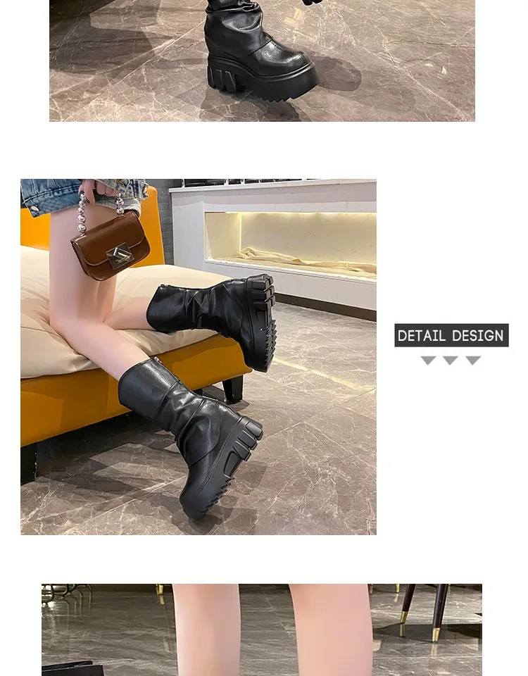 9CM Women Mid Calf Boots Autumn Winte Soft Leather Motorcycle Boots High Platform Square Heels Ladies Chunky Shoes Botas Mujer