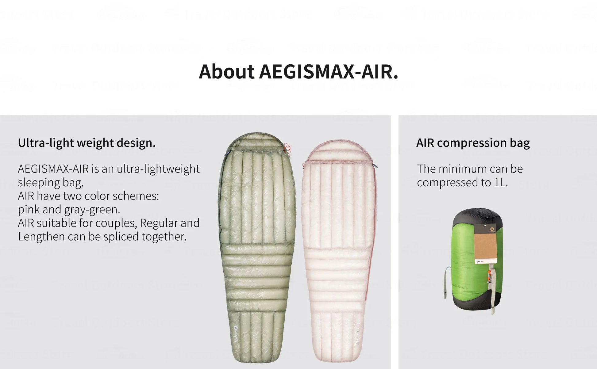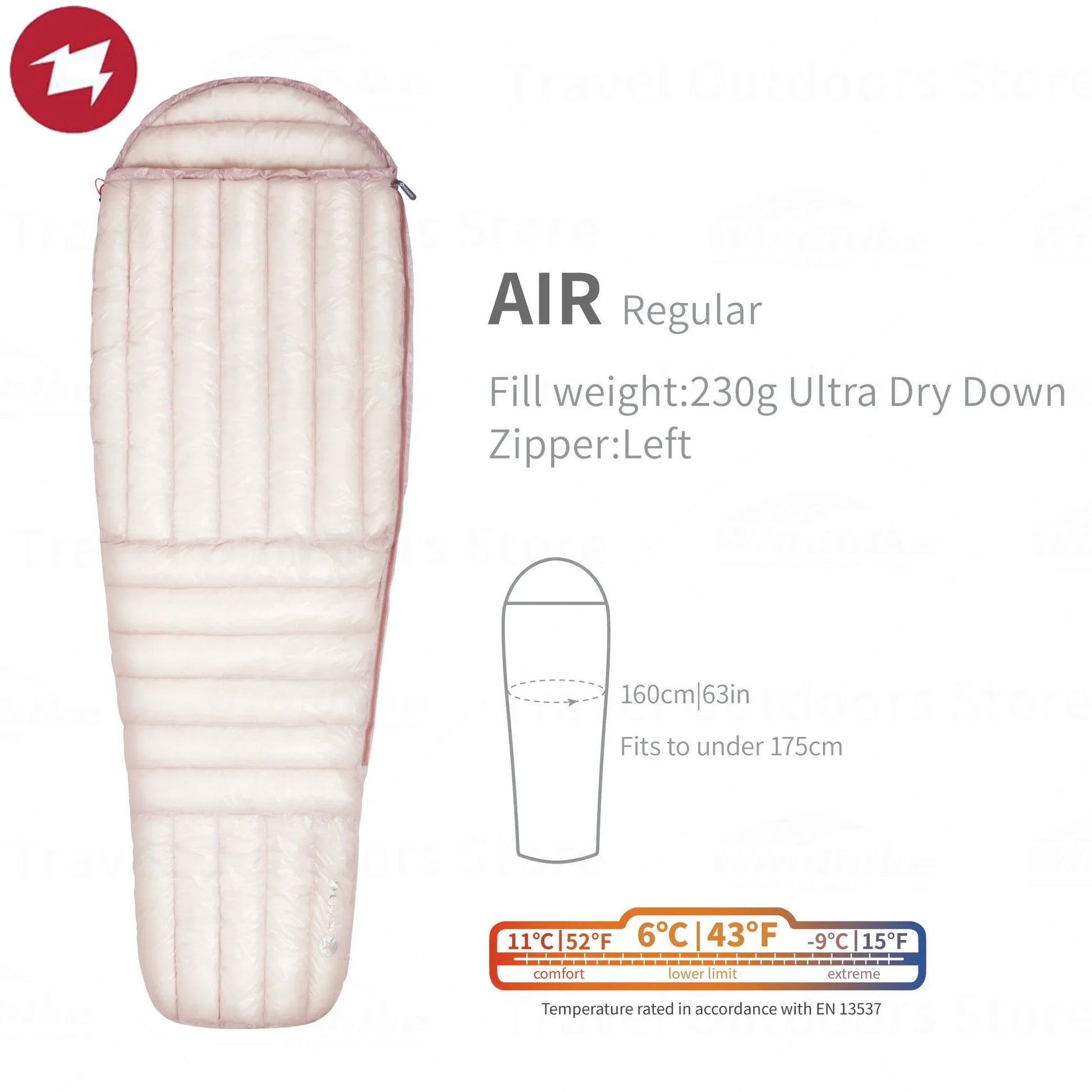 AIR Regular:Fill weight: 230g | Sleeping weight: 399g | Total weight: 438g | Package: 25x12cm
