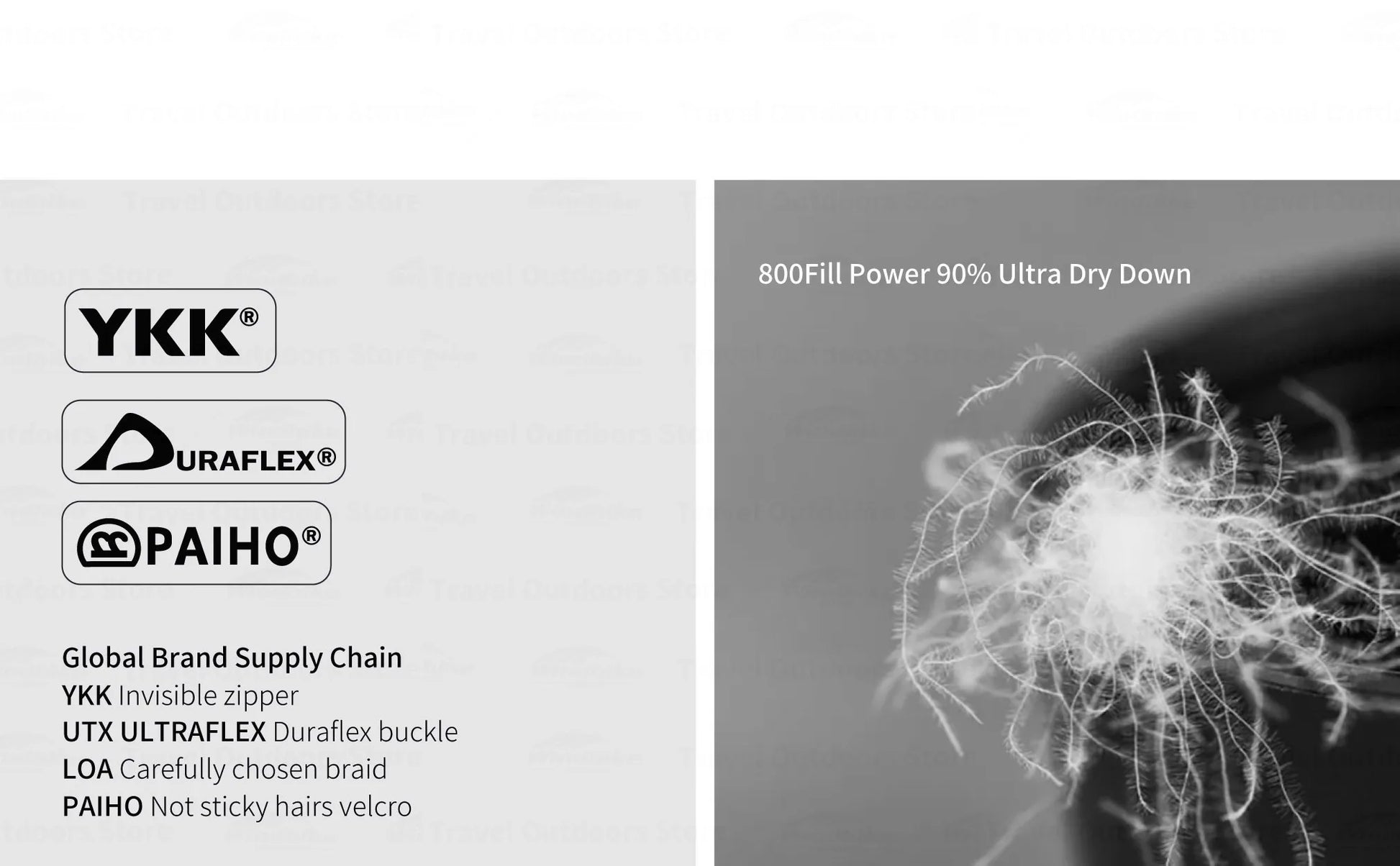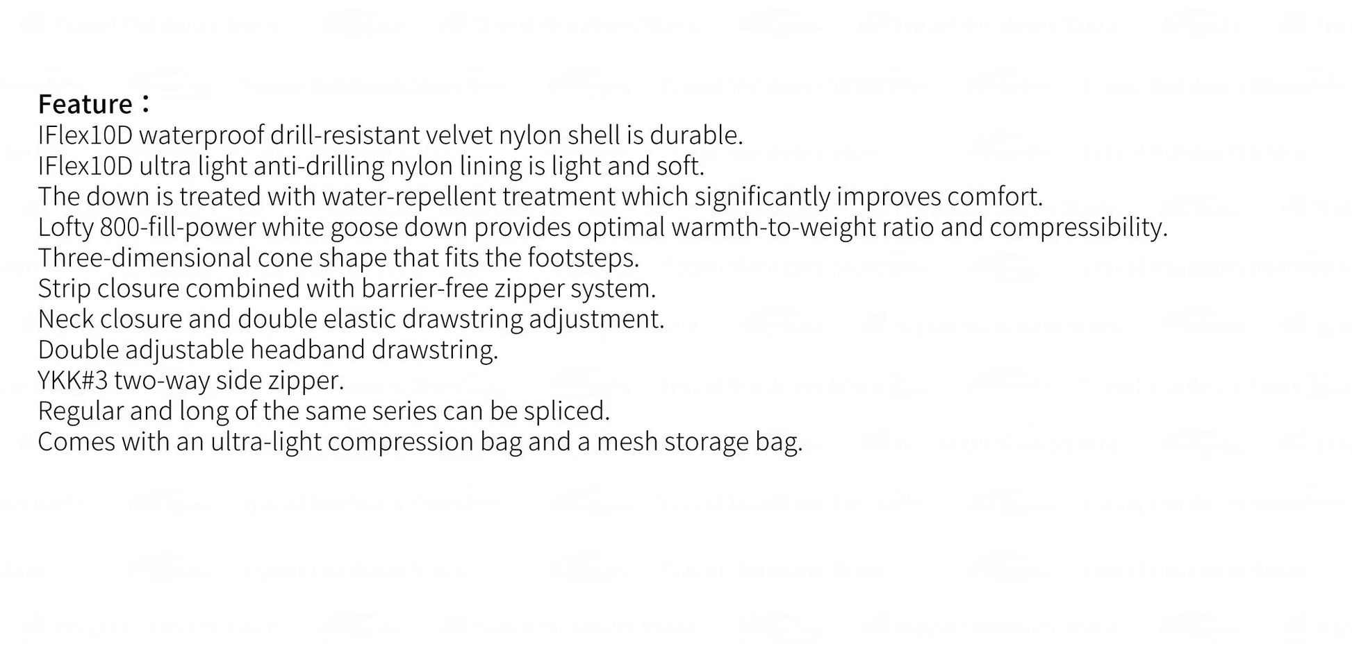 Technical Specs: iFlex® 10D DWR Ripstop Nylon Fabrics | Ultra Dry White Duck Down 800FP | iFlex® 10D Touch soft Ripstop Nylon Inner Fabrics | Anti-Snag Zipper Tracks | Regular and Lengthen can be spliced | Storage bag and stuff sack included.
