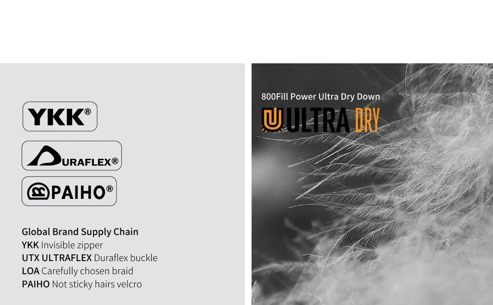 iFlex 10D DWR Ripstop Nylon Fabrics | Ultra Dry Down Pro 800FP | iFlex 10D Touch soft Ripstop Nylon Inner Fabrics | Anti-Snag Zipper Tracks