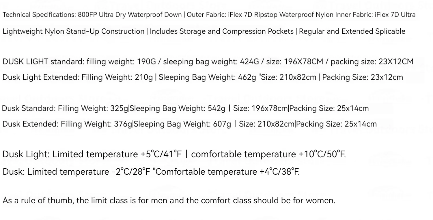 Sleeping bag weight: About 424g (Standard) / 462g (Extended)