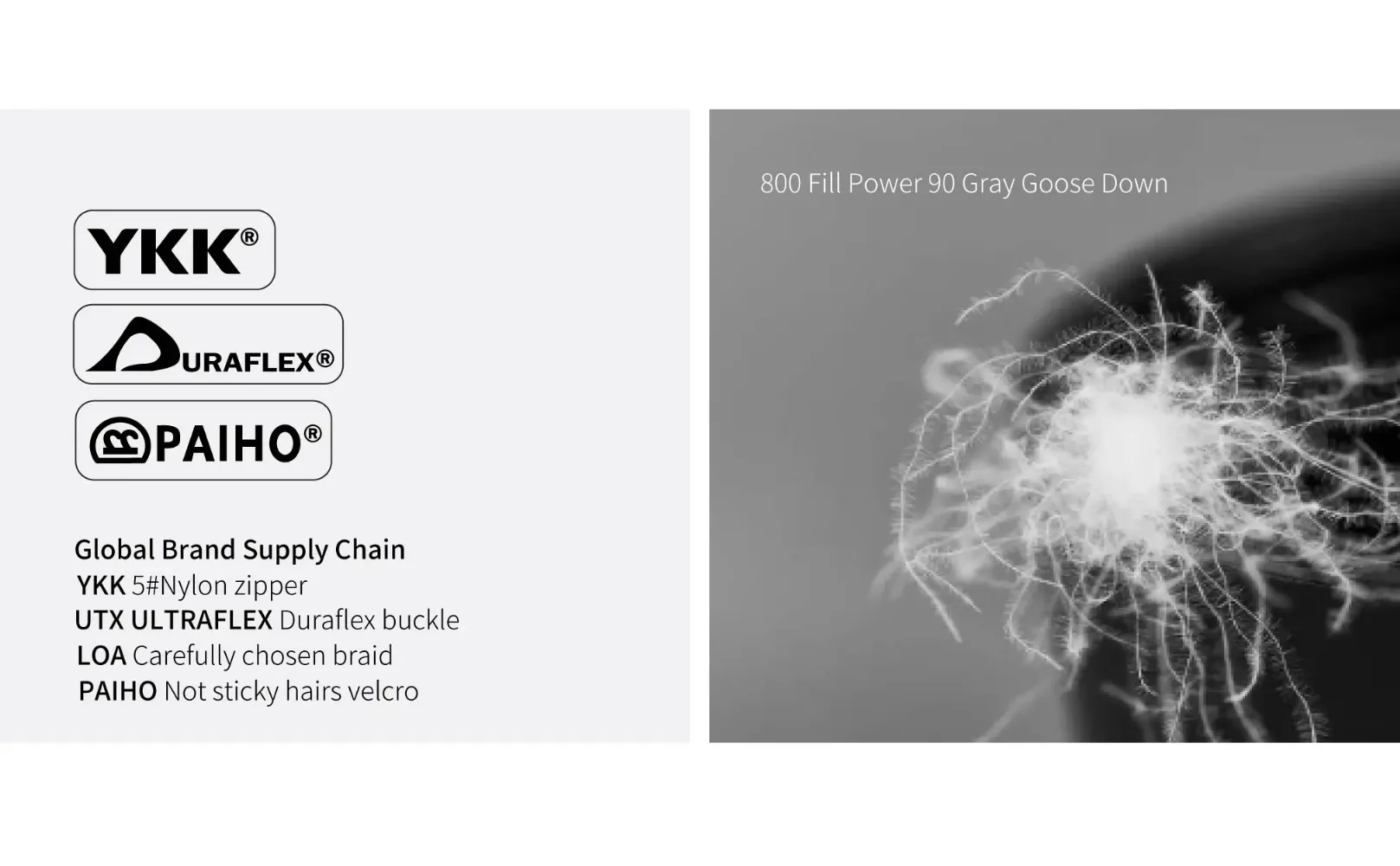 Water-resistant 800-fill-power goose down and a down proof IFlex® shell with durable water repellent (DWR) finish provide lasting coziness and a super soft feel;