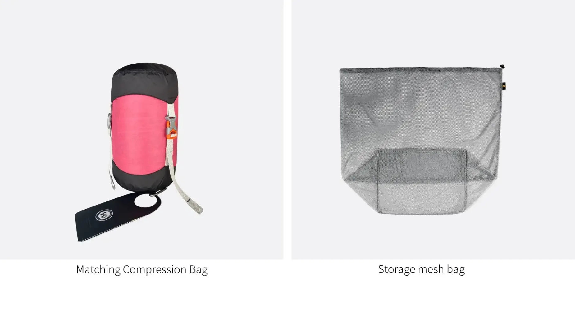 Includes a stuff sack for packing and a roomy mesh sack for breathable storage.