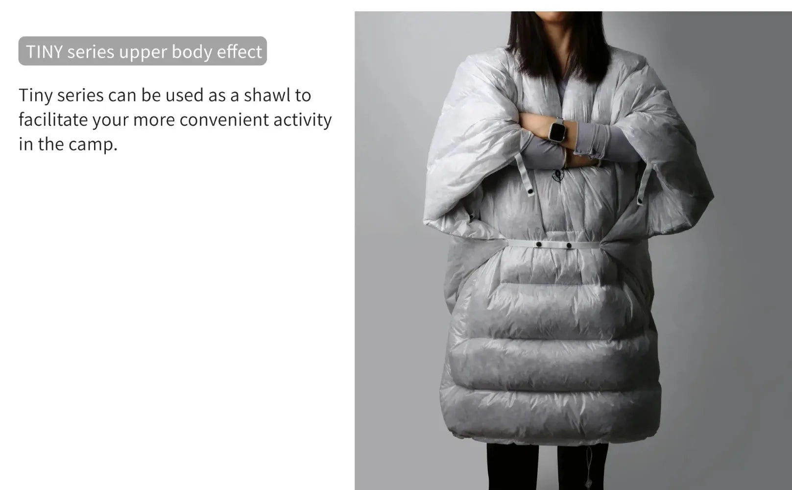 TINY is a wearable sleeping bag, It can be used in many occasions: zip it up, it is a regular envelope sleeping bag;