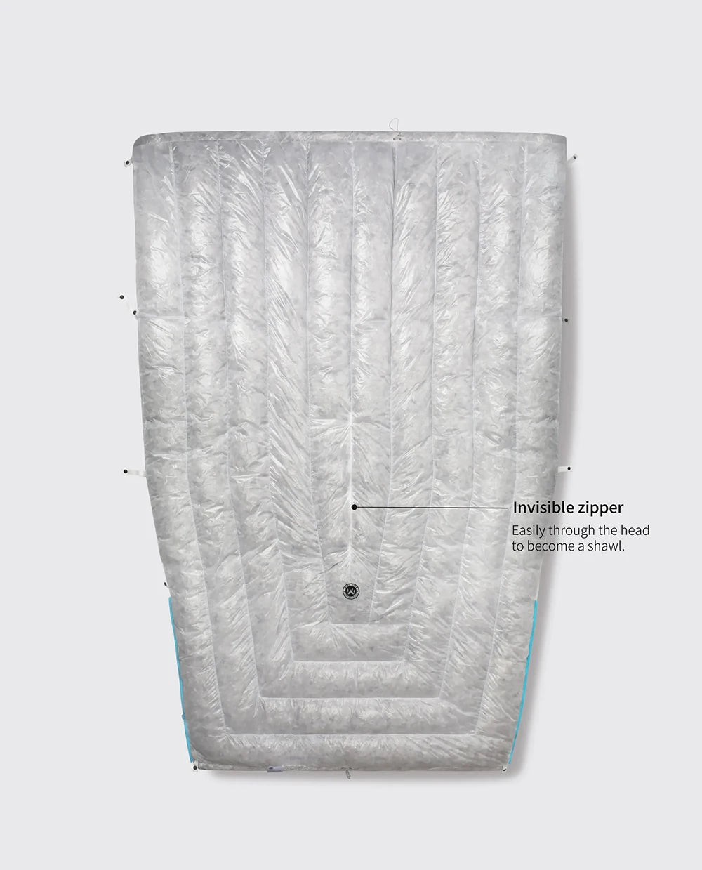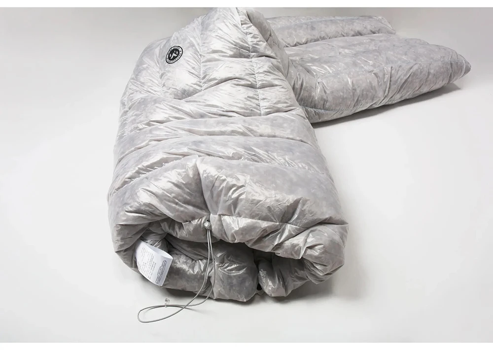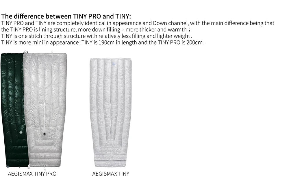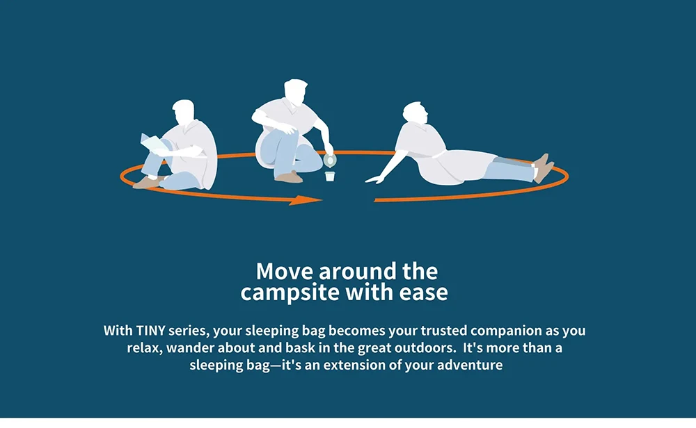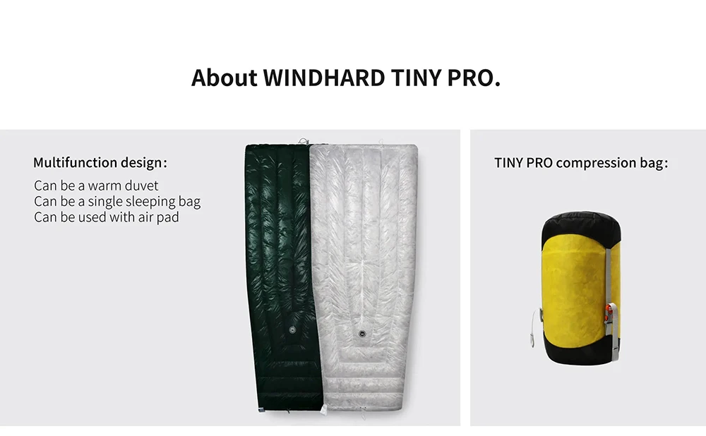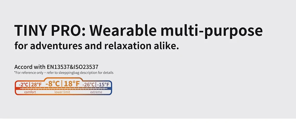 TINY PRO is a wearable sleeping bag, It can be used in many occasions: zip it up, it is a regular envelope sleeping bag; It can also be used with an air cushion to isolate the cold ground and air cushion in cold temperatures, Increase warmth and comfort; when fully unfolded, it can be used as a duvet; There is a hidden zipper in the middle of the sleeping bag, the head goes through the zipper, and it naturally falls into a shawl, and the cuffs have buckles to fasten, keeping warmth without affecting activities.