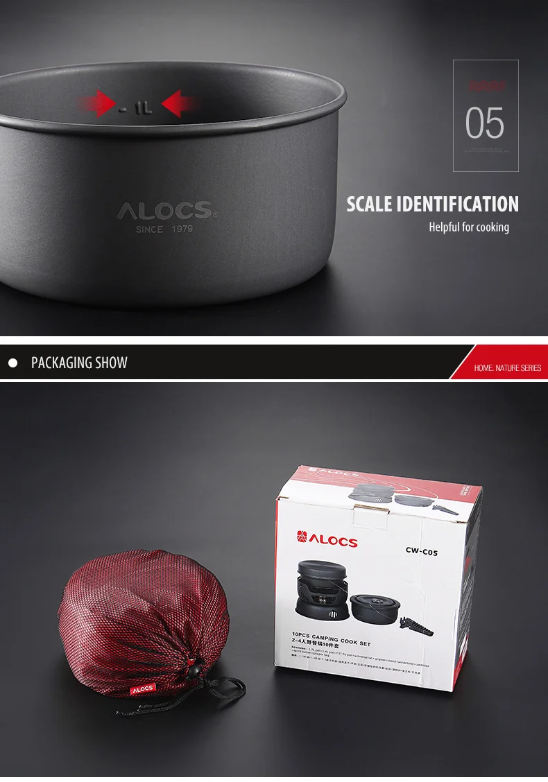 ALOCS CW-C05 Set of 10 Pieces Outdoor Camping Cooking Set Utensil Alcohol Stove Spirit Burner Cooker Pot Frying Pan Windshield