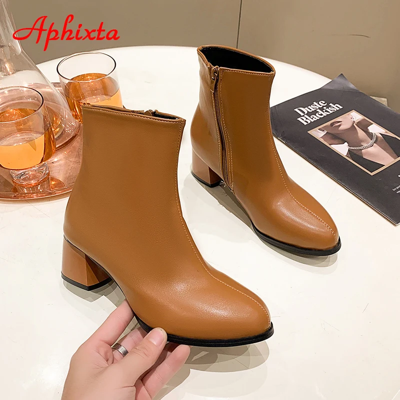 Aphixta 2023 Winter Side Zipper Shoes Women Boots 5cm Square Heel Ankle Boots Brown Botines Mujer Ladies Big Size Shoes