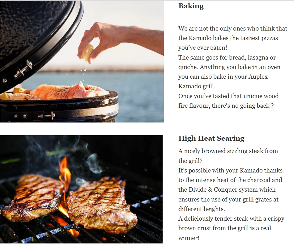 1.Great heat retention 2. smoked flavor ,High tightness, fuel saving 3. High searing temp down to slow smoking 4.Griller for searing, Smoker for indirect heat, Oven for Bake pizza or roast for all thicker pieces of meat, whole chicken etc.5. foods grilled more juciy than gas grill's.