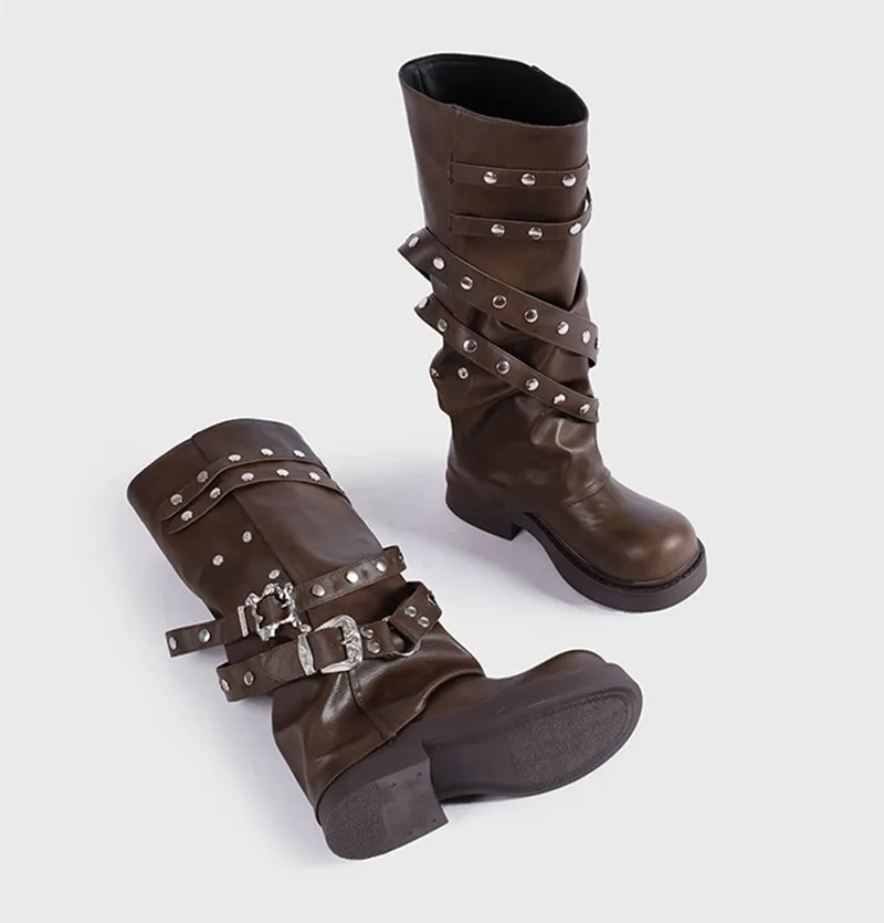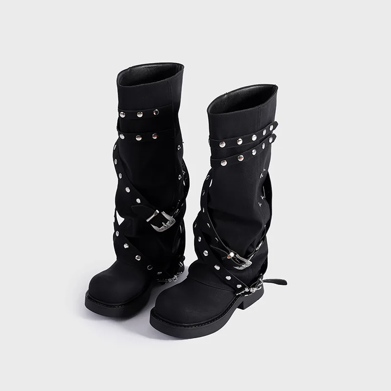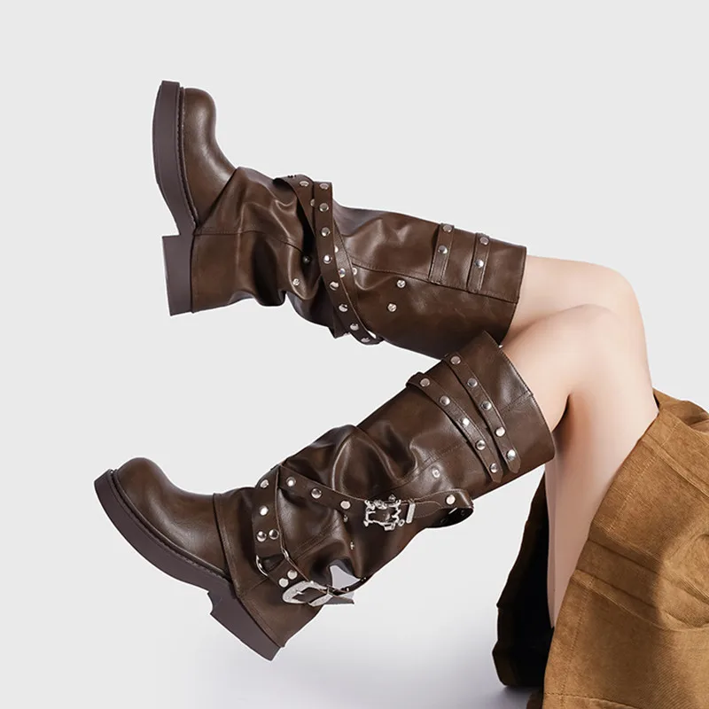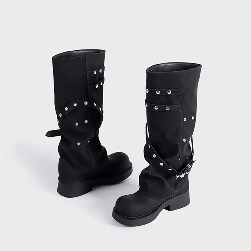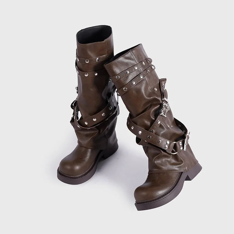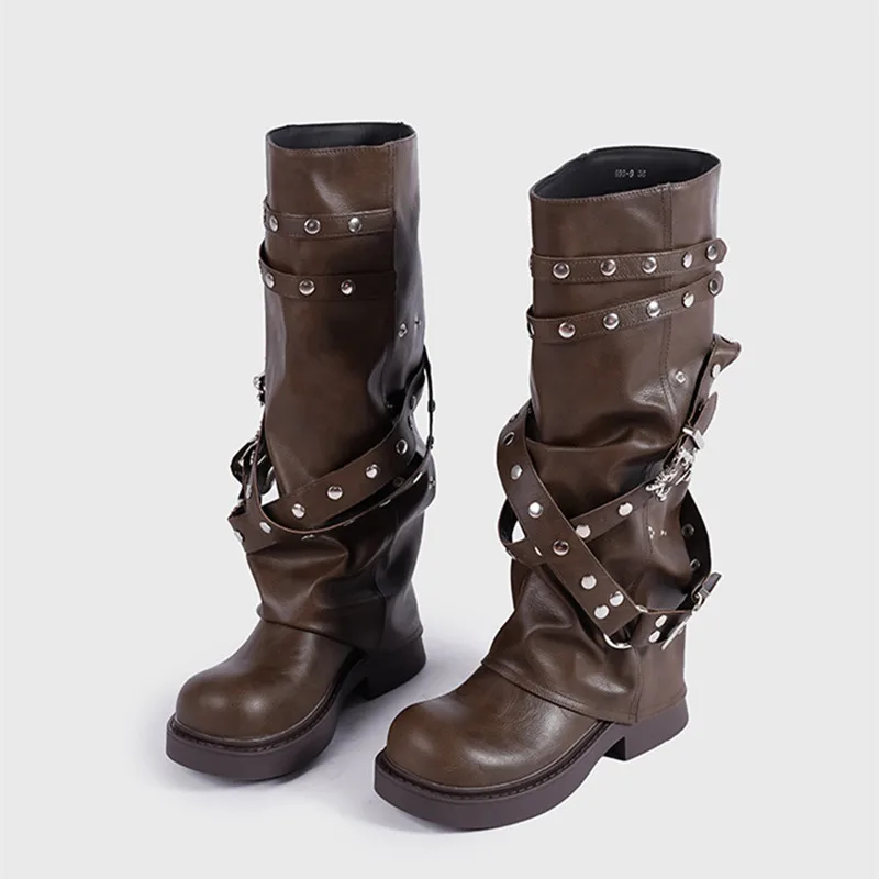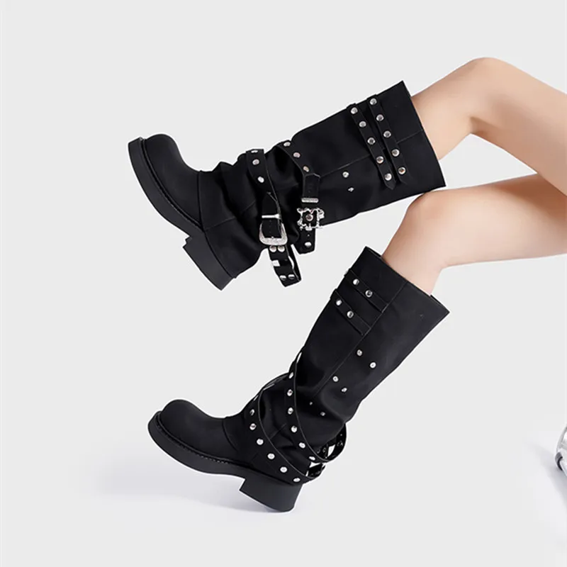 Autumn Winter Vintage Rivet Belt Buckle Women Punk Motorcycle Boots Fashion Square Heeled Knee-high Knight Tube Long Booties