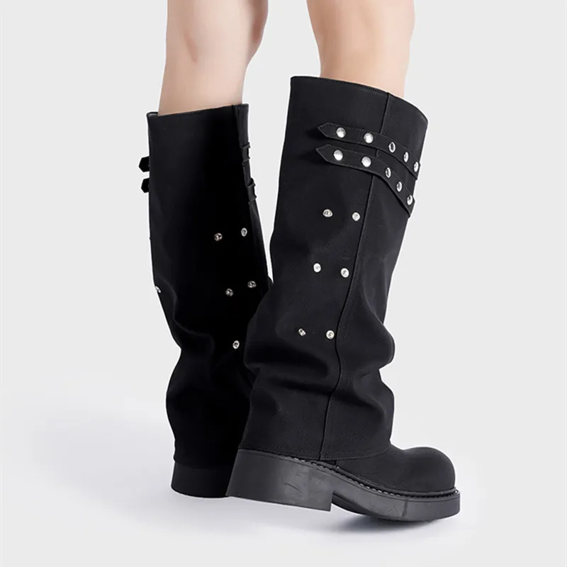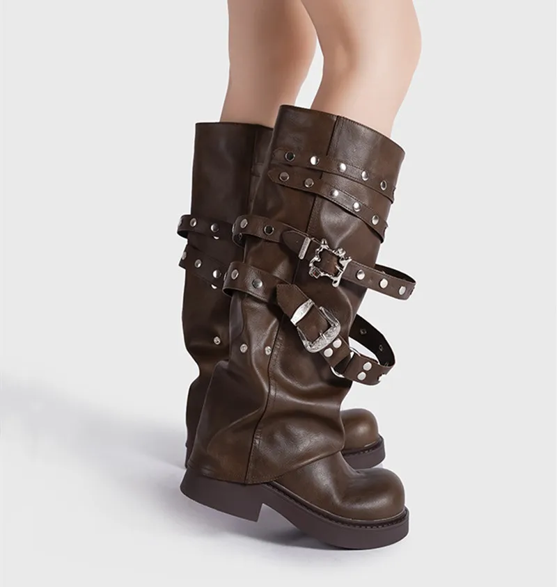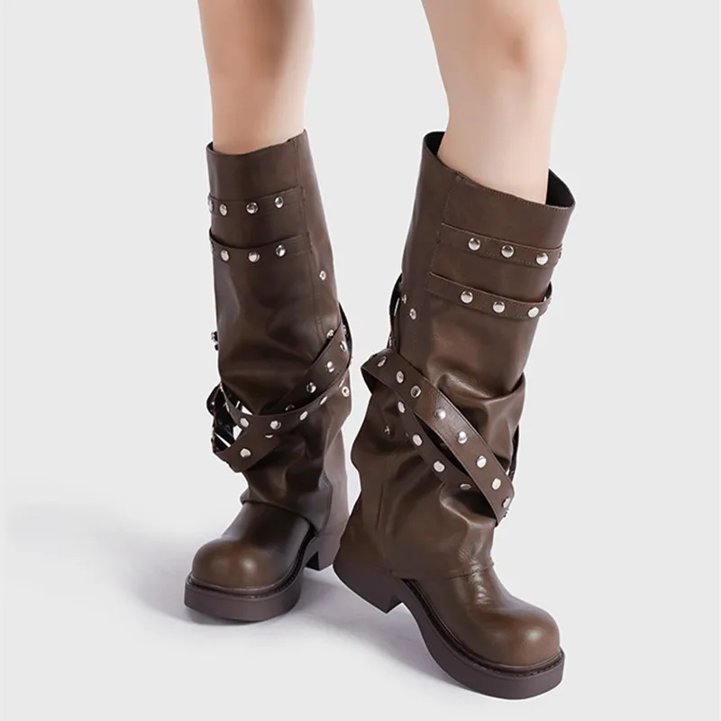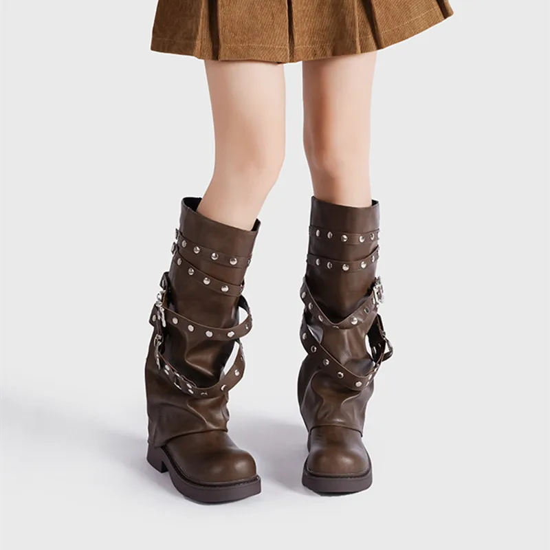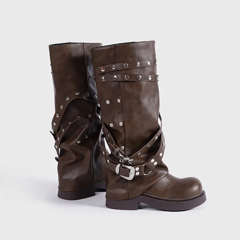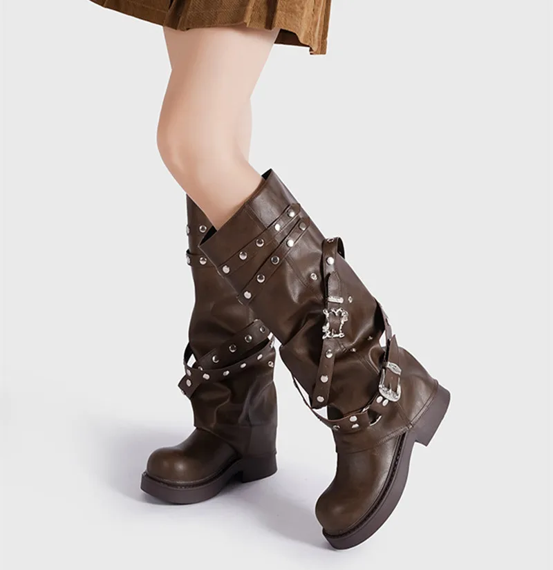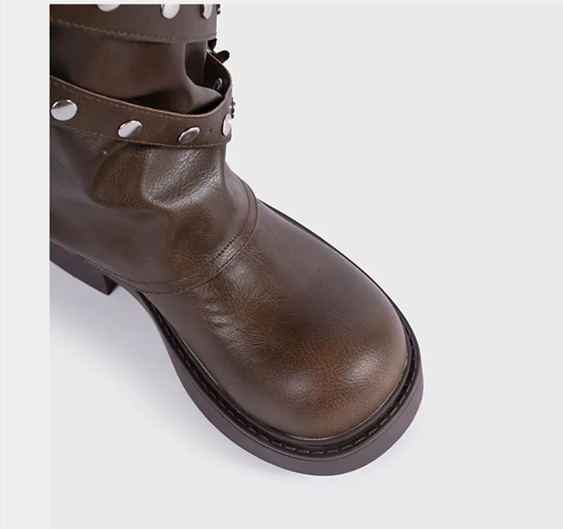 Autumn Winter Vintage Rivet Belt Buckle Women Punk Motorcycle Boots Fashion Square Heeled Knee-high Knight Tube Long Booties