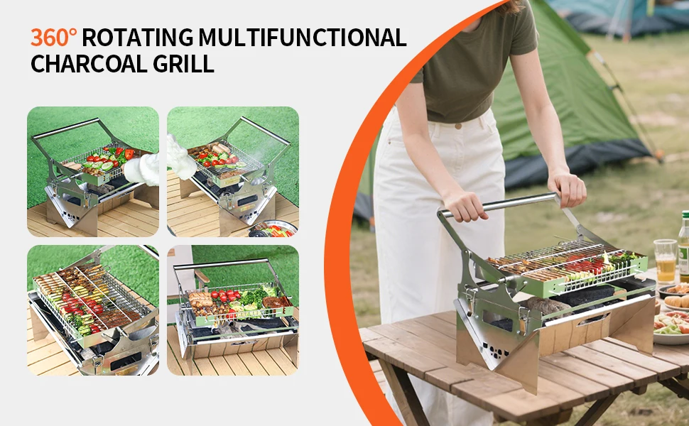 【With Manual flip Handle】:360° rotating bbq grill ,it can makes the food roast more evenly.
