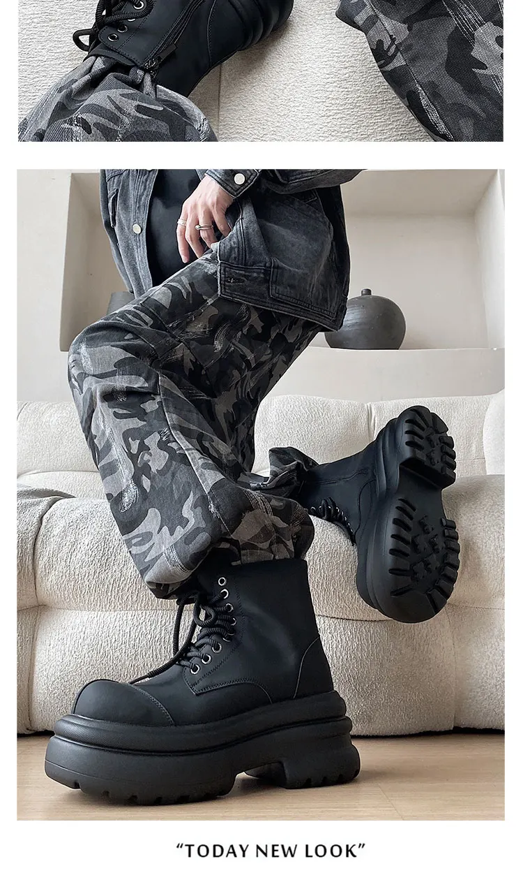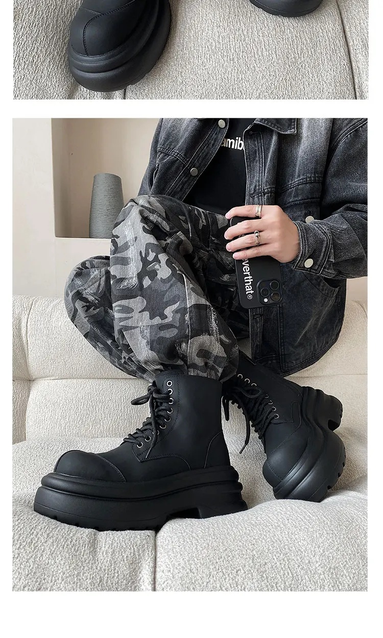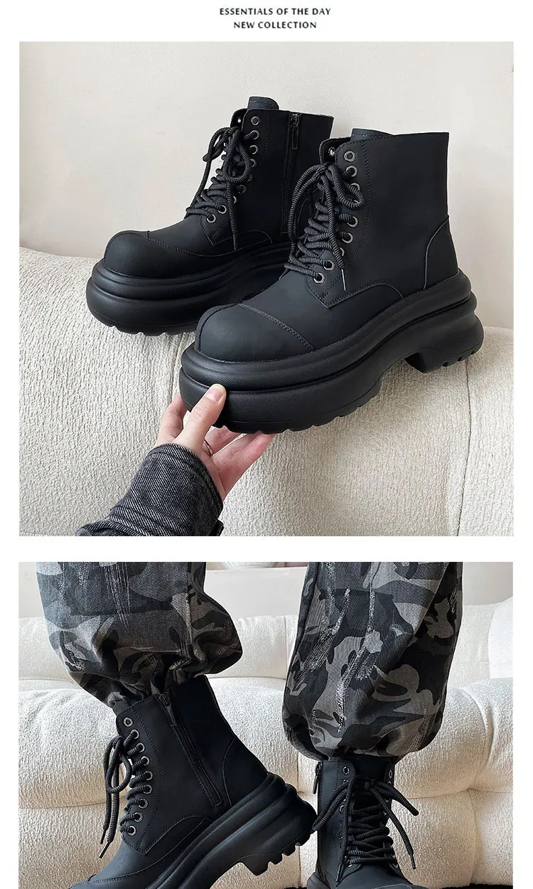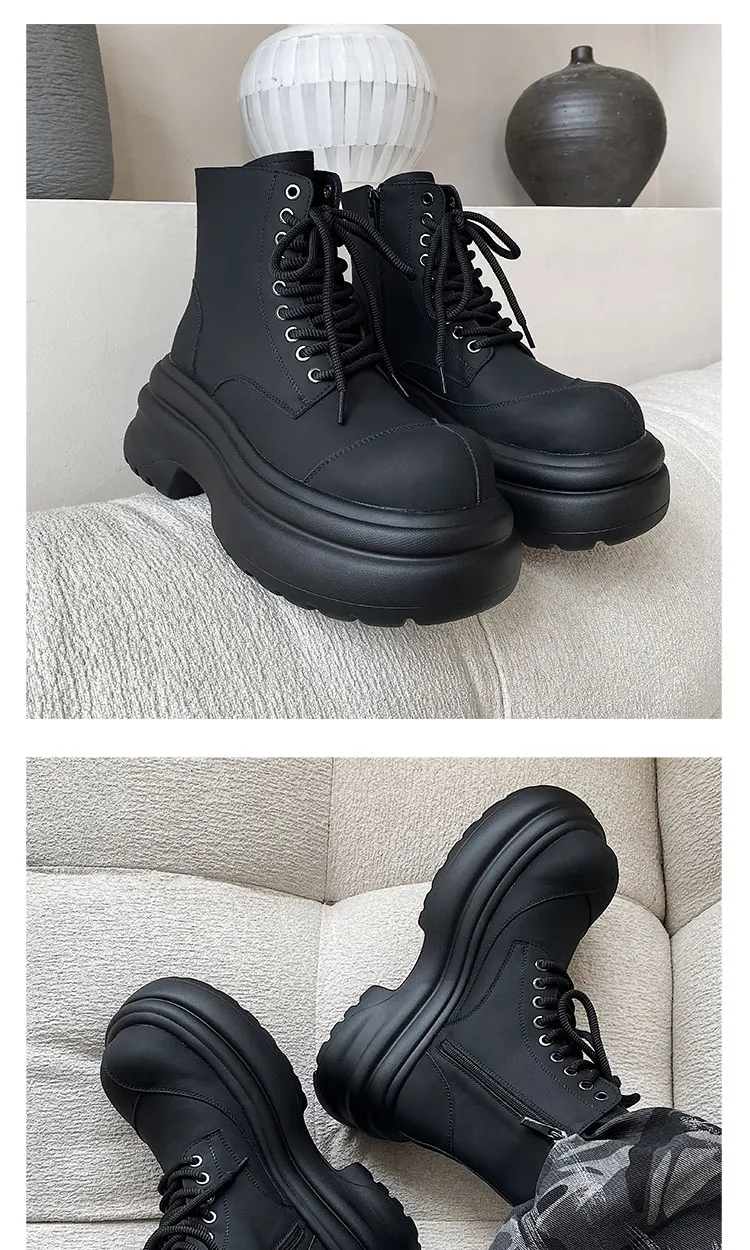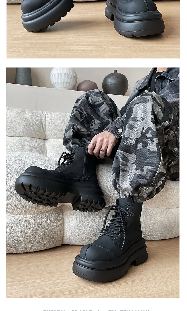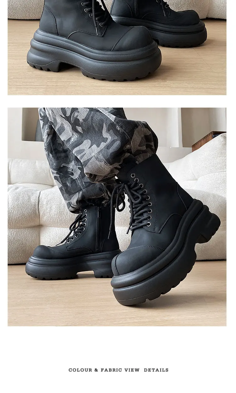 Black boots for men thick sole 7CM height increase high top motorcycle boots trendy and fashionable outdoor workwear shoes