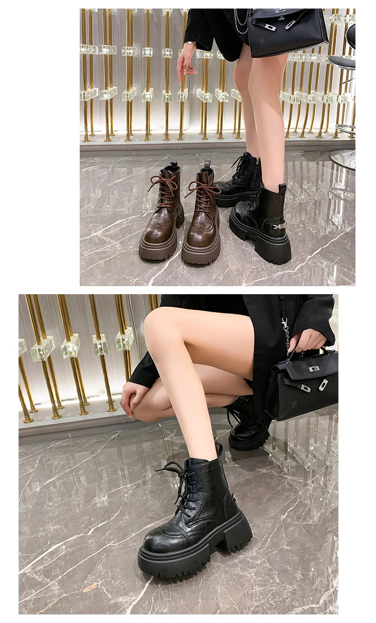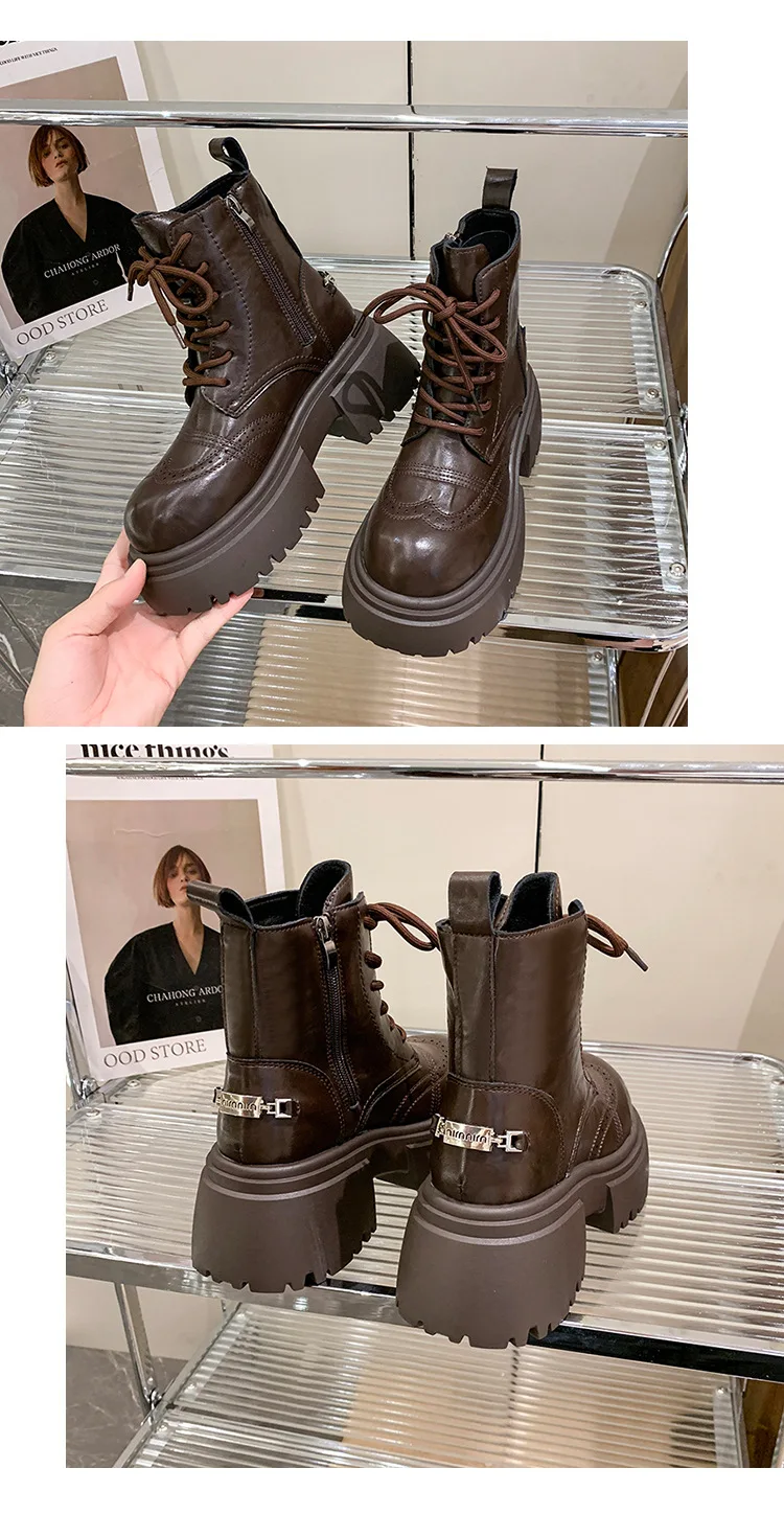 Boots Woman 2025 Trend Female Shoes Winter New British platform Lace up zipper ankle boots Plush Flat Heel Motorcycle boots