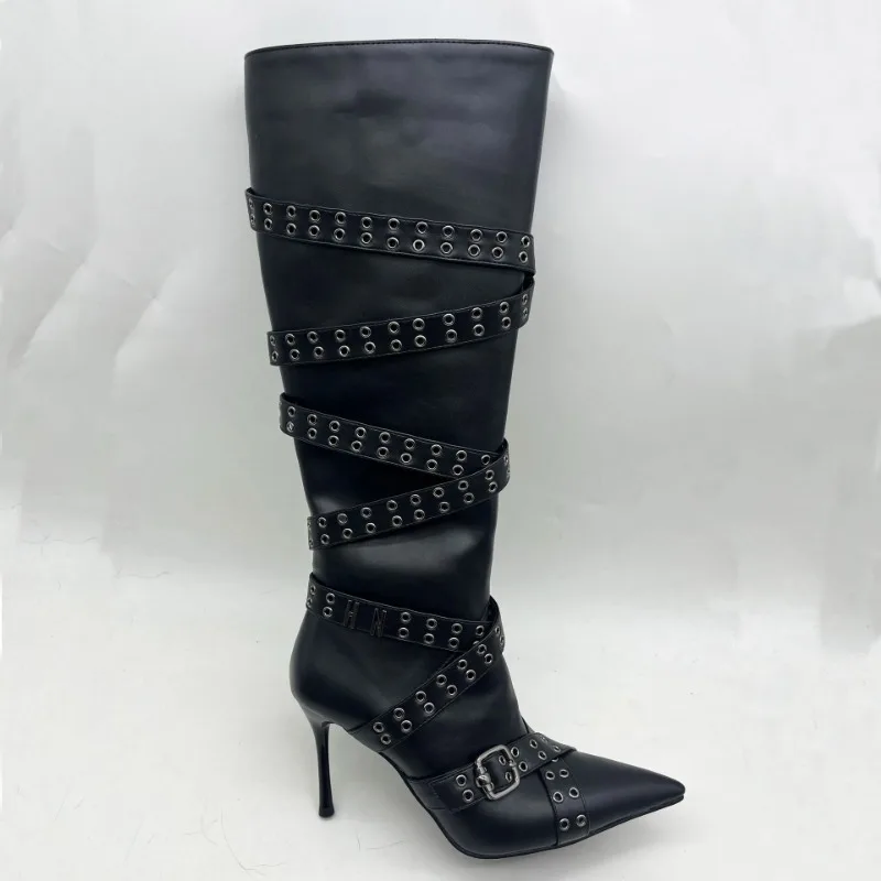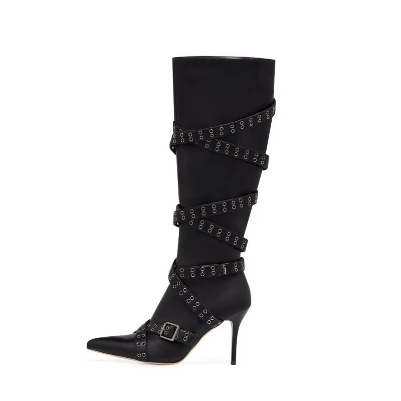 Brand Cross Strap Riveted Retro Silvery Knee High Boots New Spicy Girl Pointed High Heel Motorcycle Boots Fashion Women Shoes