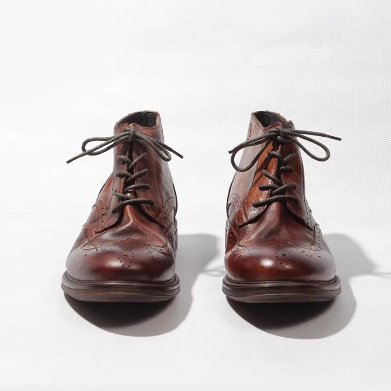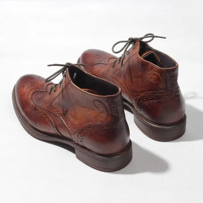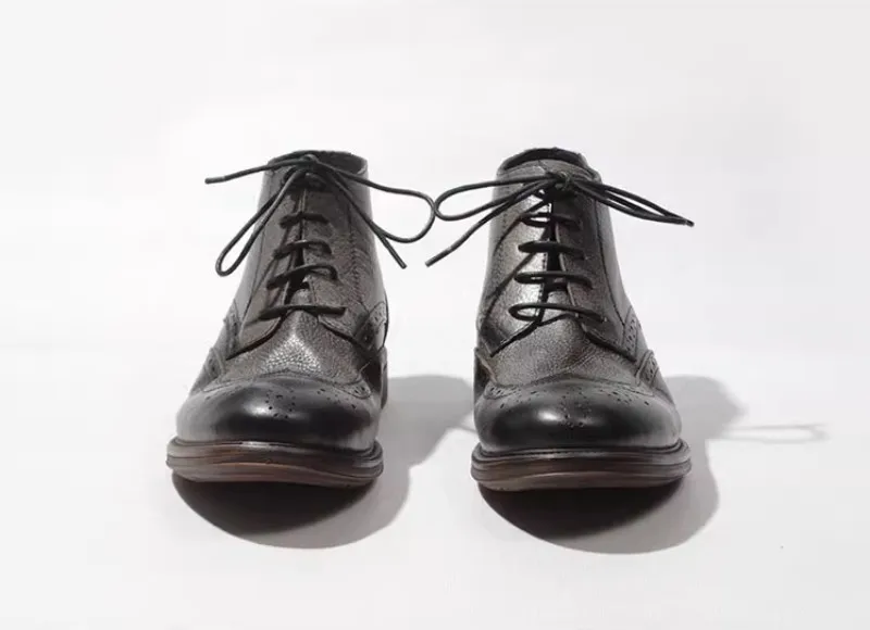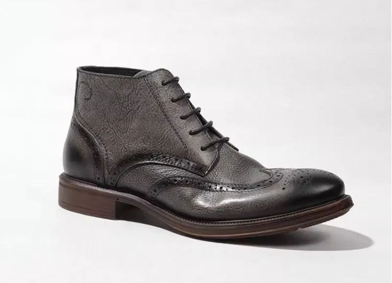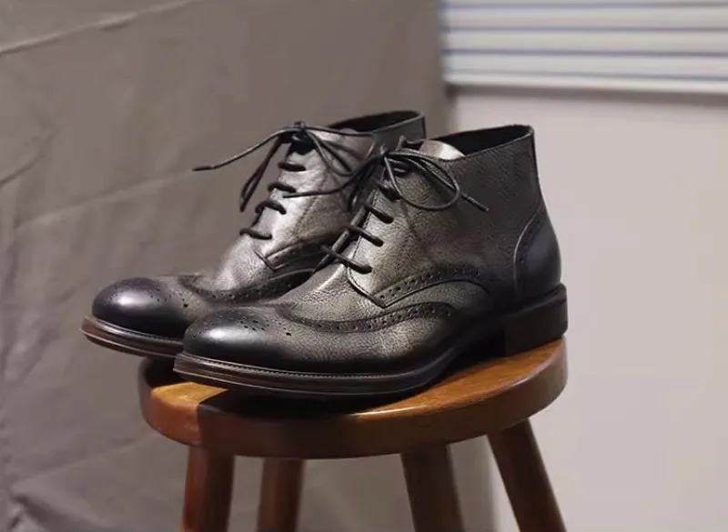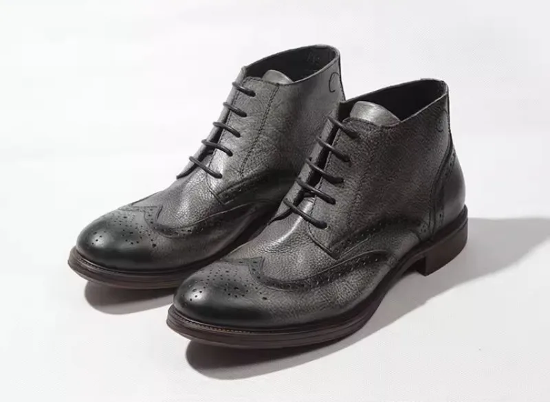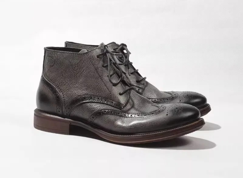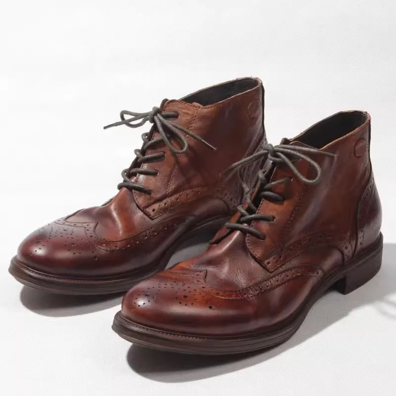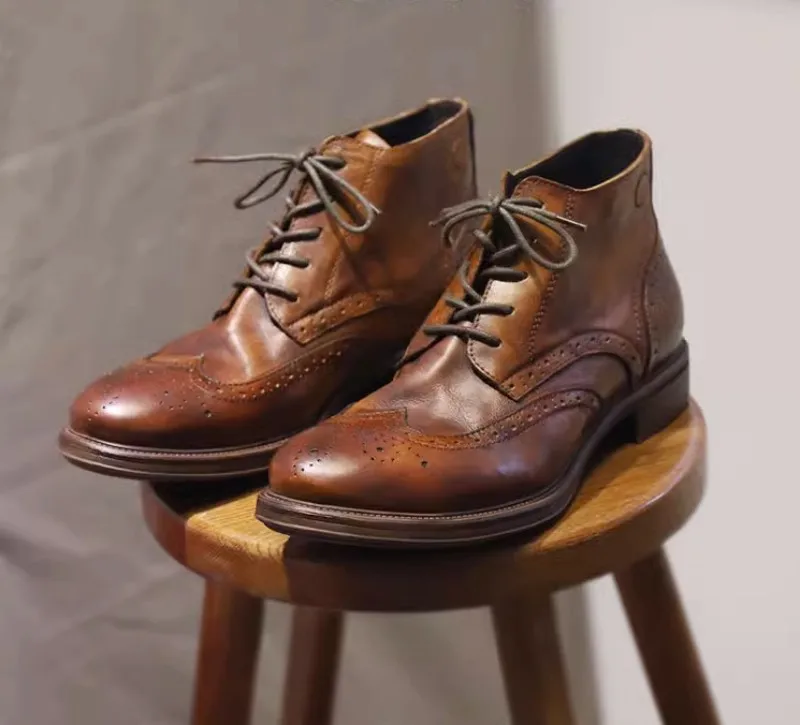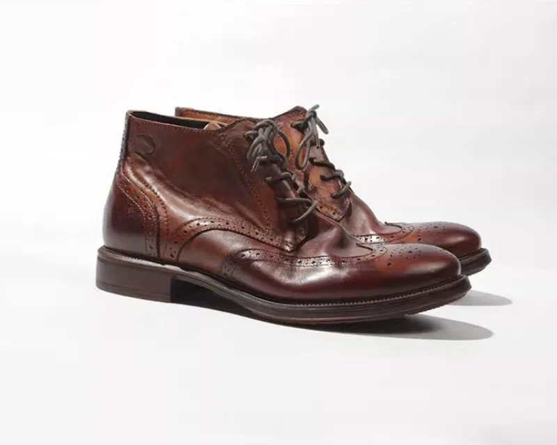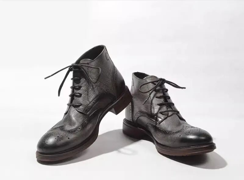 Casual Handmade Vintage Cowhide Genuine Leather Short Boots Men Carving Design High Top Cargo Shoes Men Lace Up Motorcycle Boots