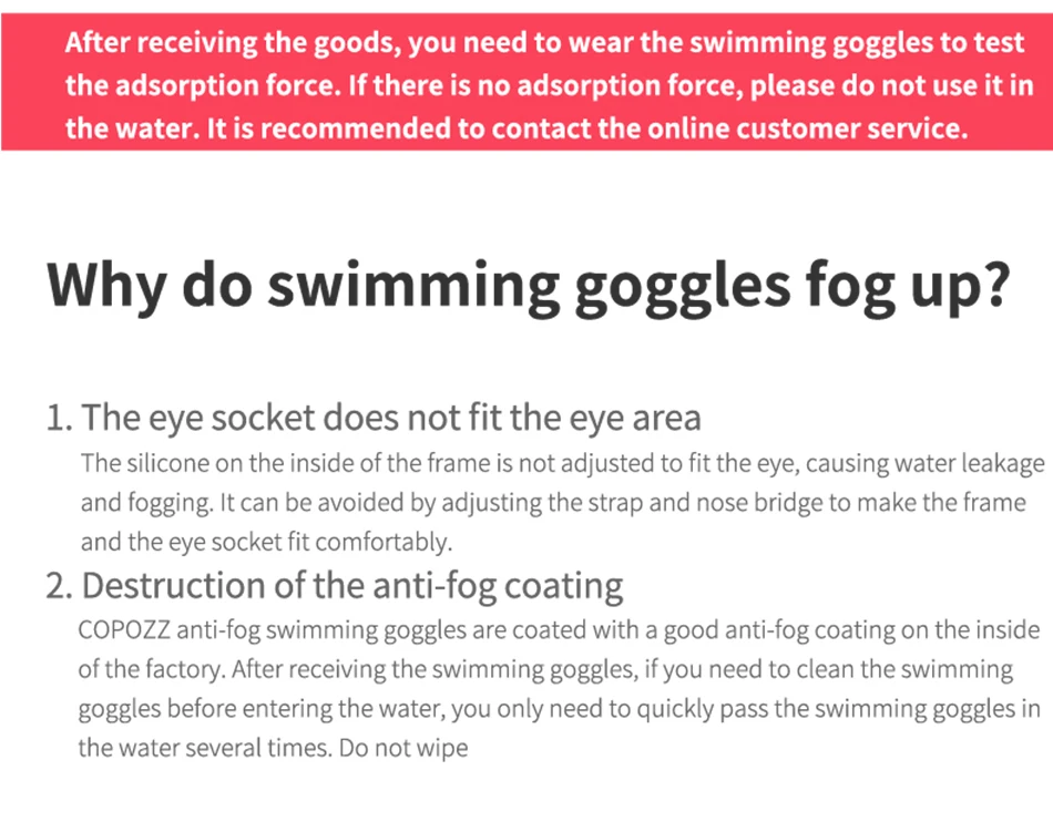 The goggles have thickened gaskets so you won't feel uncomfortable while swimming, while also preventing goggles from leaving marks around the eye rims