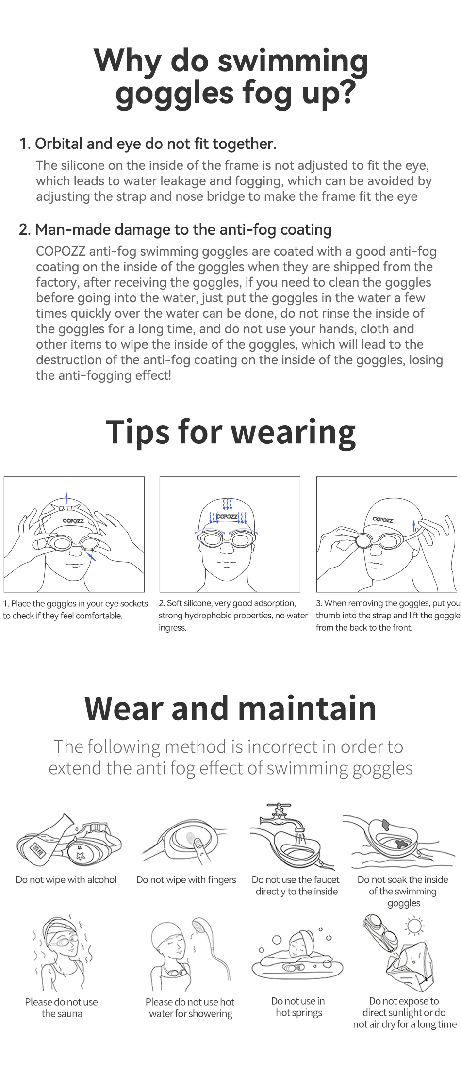 1. Please wash the goggle gently in clean water after using, shake off water-drops and then dry the goggle with a drier.