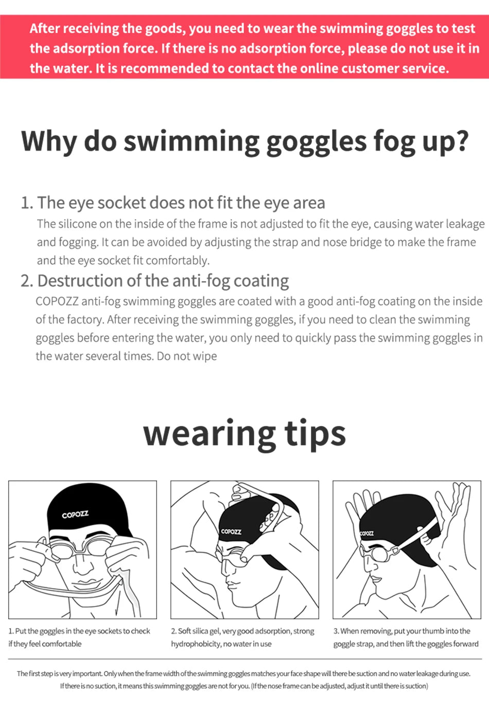 Because the moisture rolls back and forth on the surface of the anti-fog layer, it has an anti-fog effect. Please wet the swimming goggles with water before use. (The anti-fog surface will feel sticky and slippery when exposed to wet water.)