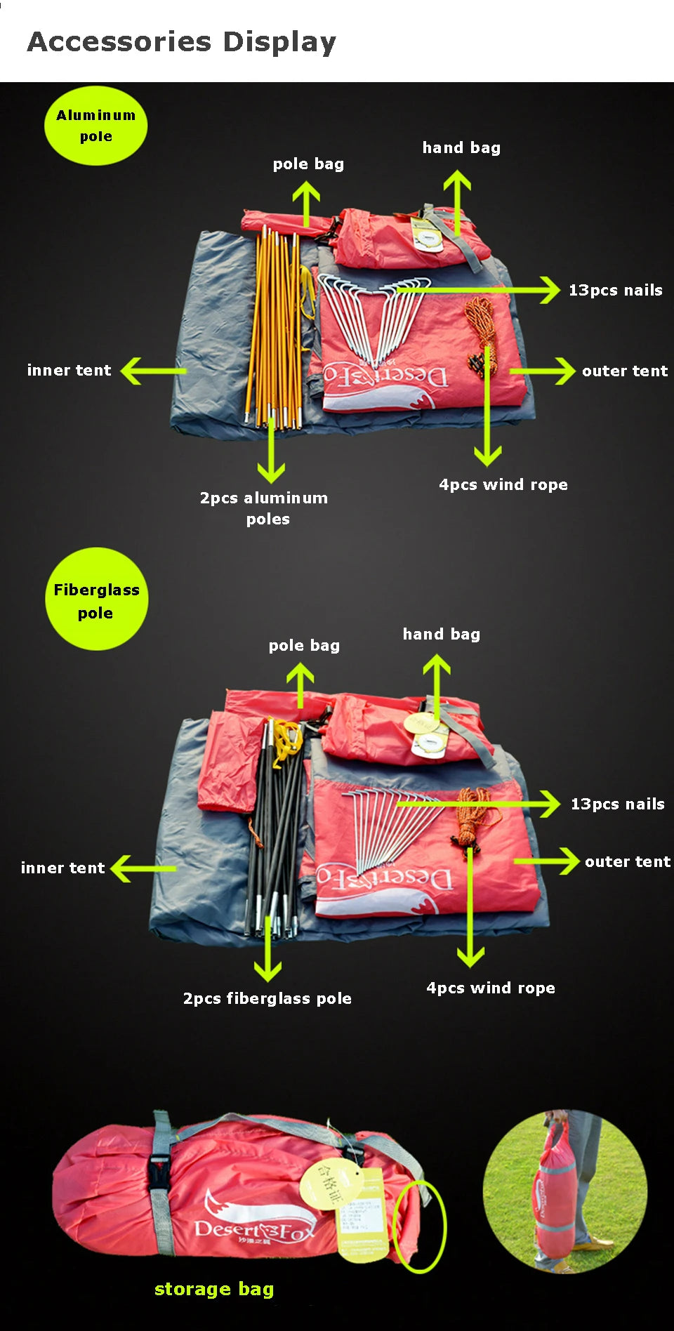 Accessories: 13x tent peg,4x ropes,2x tent poles
