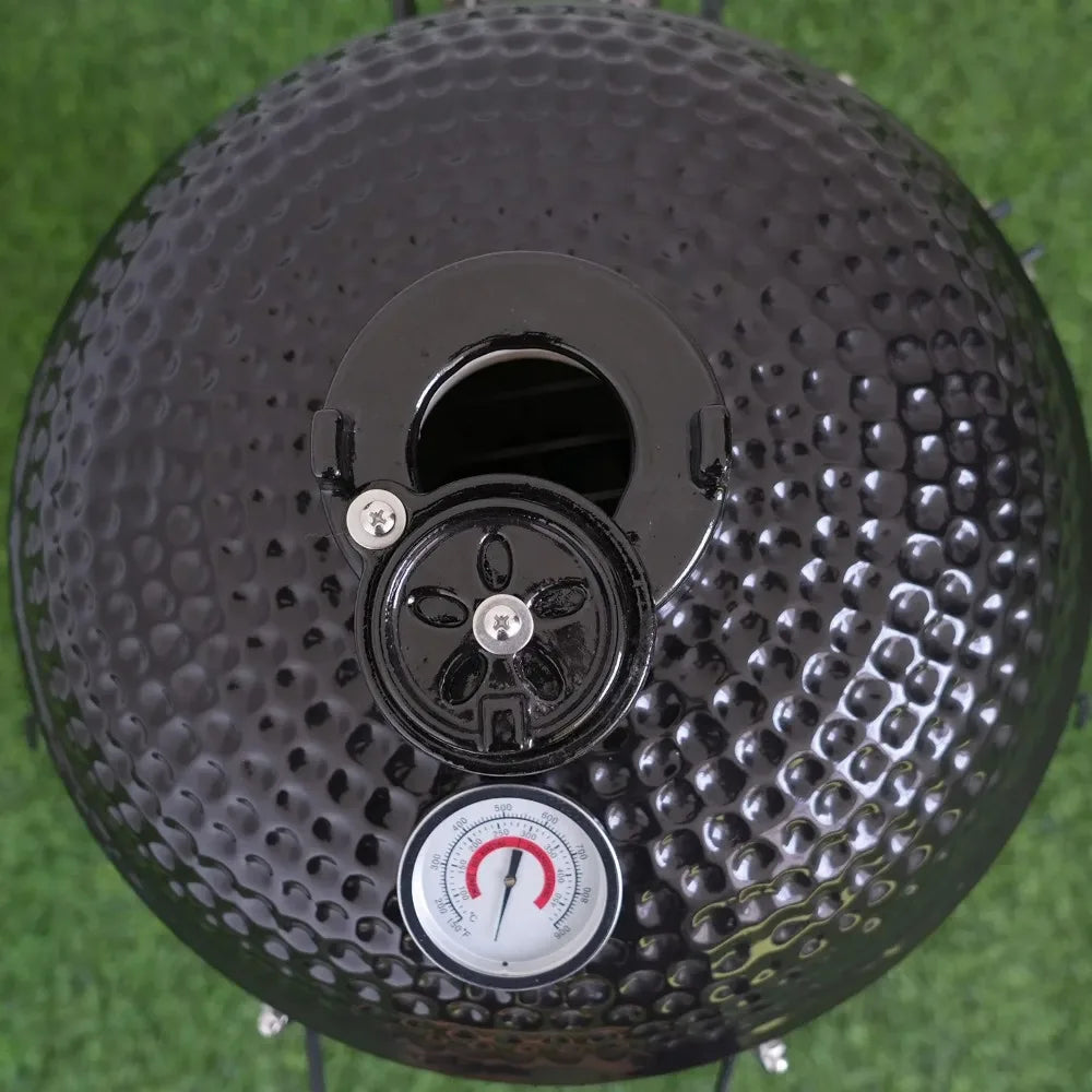 The Kamado Grill features an elegant, egg-shaped design crafted from premium ceramic materials, augmented by robust metal fixtures to ensure ease of use and durability. The grill surface is made from 304 stainless steel, upholding the highest standards of health and safety. Strategically positioned bamboo or plastic side shelves offer convenient spaces for food and seasoning preparation. Equipped with strategically placed chimneys and air intakes, the Kamado Grill allows for precise airflow manipulation, granting chefs the ability to control temperature with pinpoint accuracy for exceptional grilling and smoking results. Ideal for a variety of culinary applications, this grill can be fueled by charcoal or an assortment of wood types, providing limitless cooking versatility.