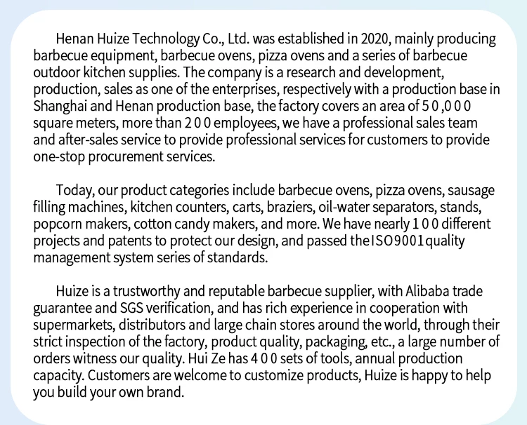 A:Our product categories include barbecue ovens, pizza ovens, sausage filling machines, kitchen counters, carts, fire POTS, oil-water separators, stands, popcorn makers, marshmallow machines, hullers, egg cartons, automatic sifters and more.