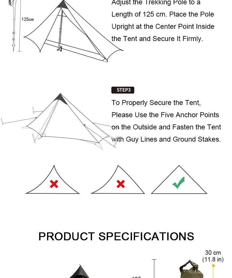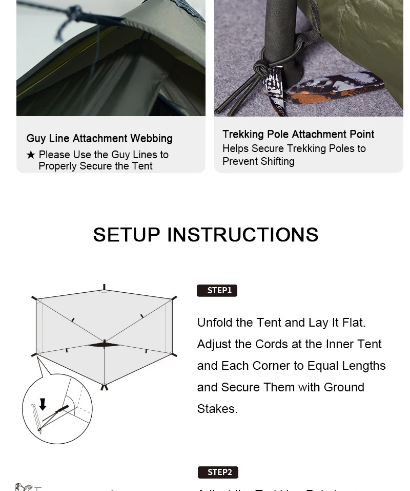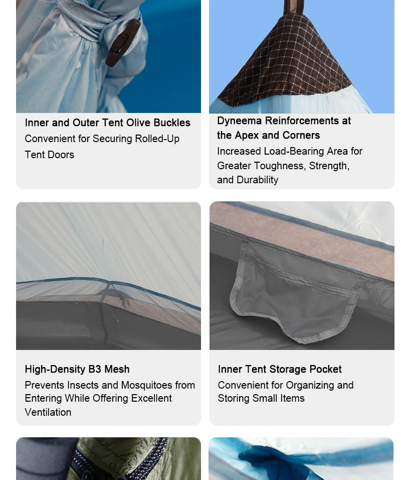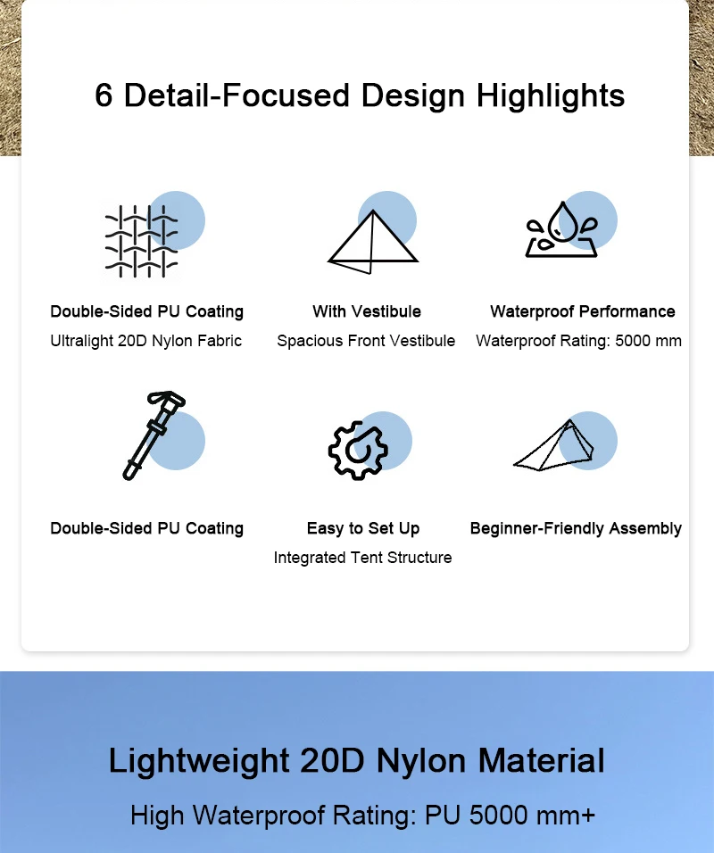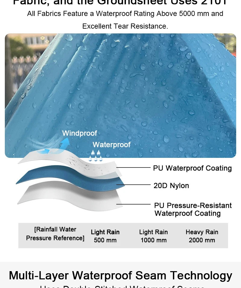 ②The outer tent is made of 20D nylon fabric, and the ground mat is made of 210T polyester. All fabrics are resistant to water pressure of more than 5000MM and have strong tear resistance.