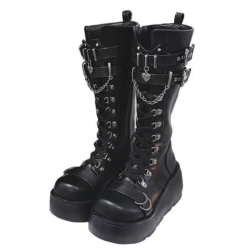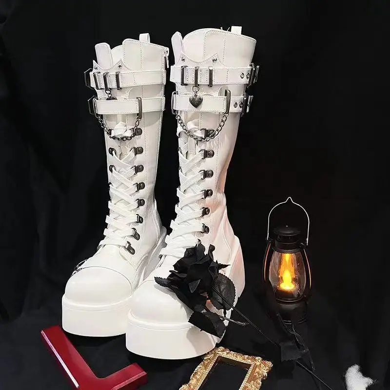 Girls Winter Motorcycle Boots Platform Boots for Women Wedges Knee High Black Lace Up Fashion Goth Gothic Boots Punk Shoes