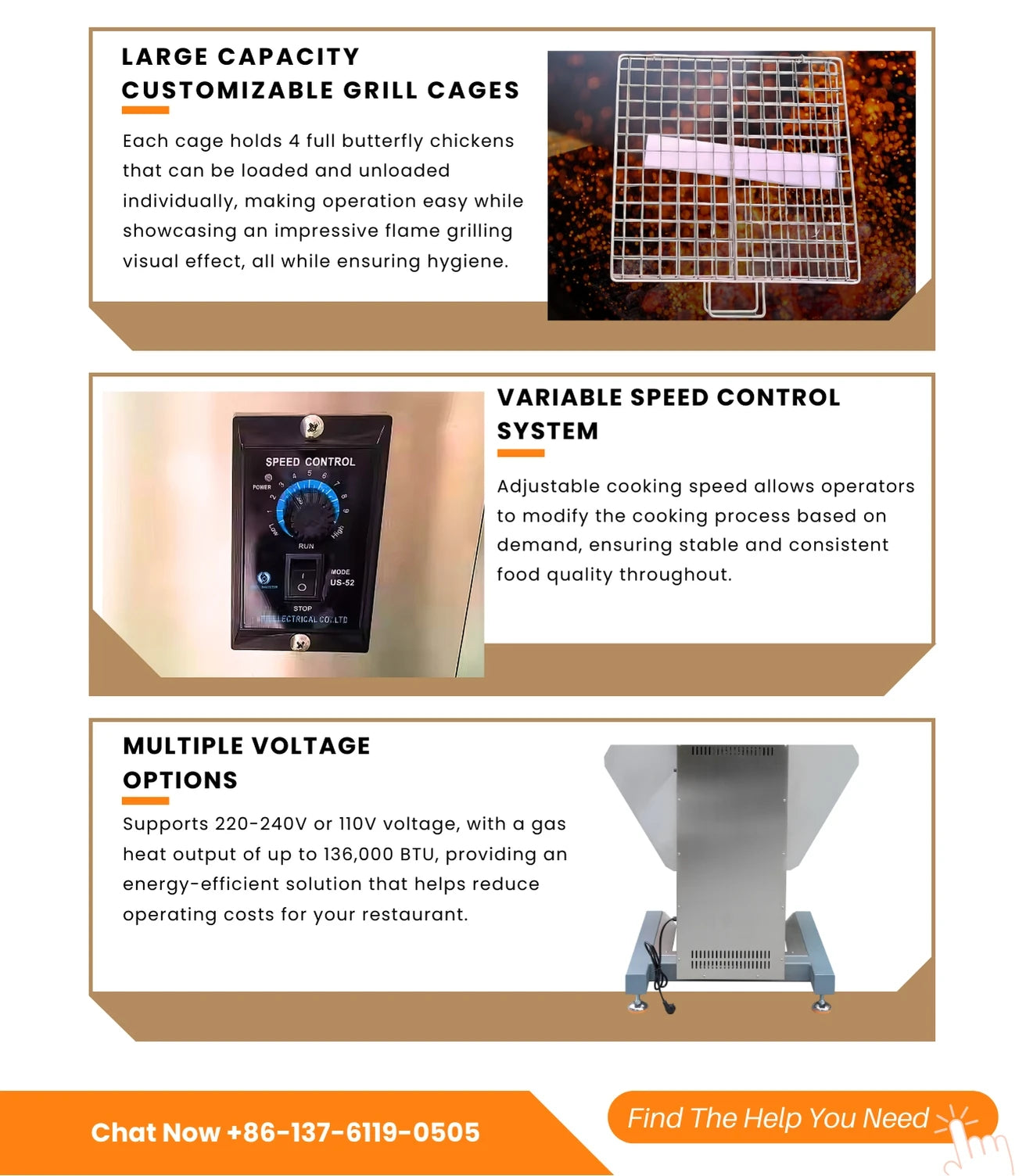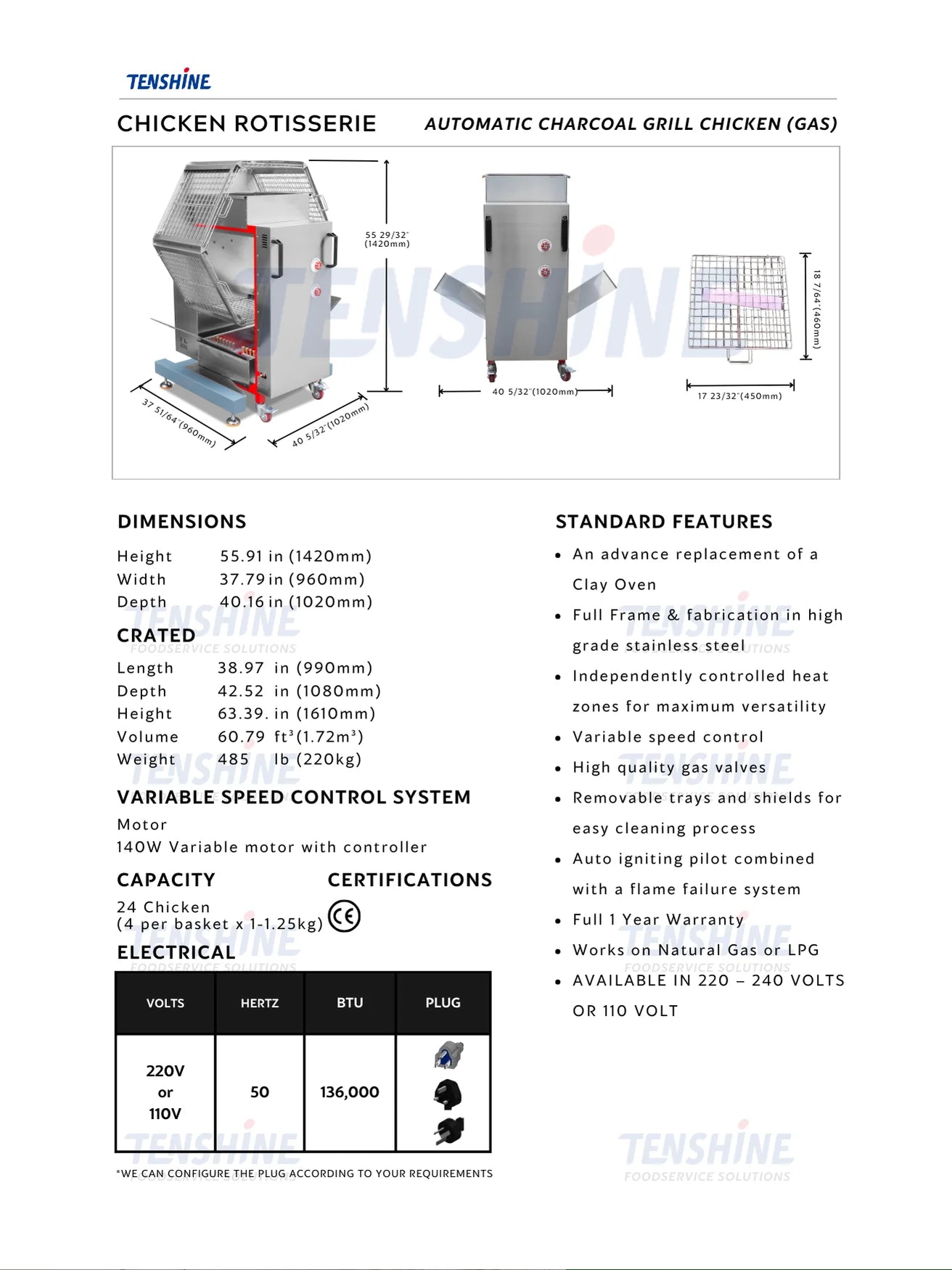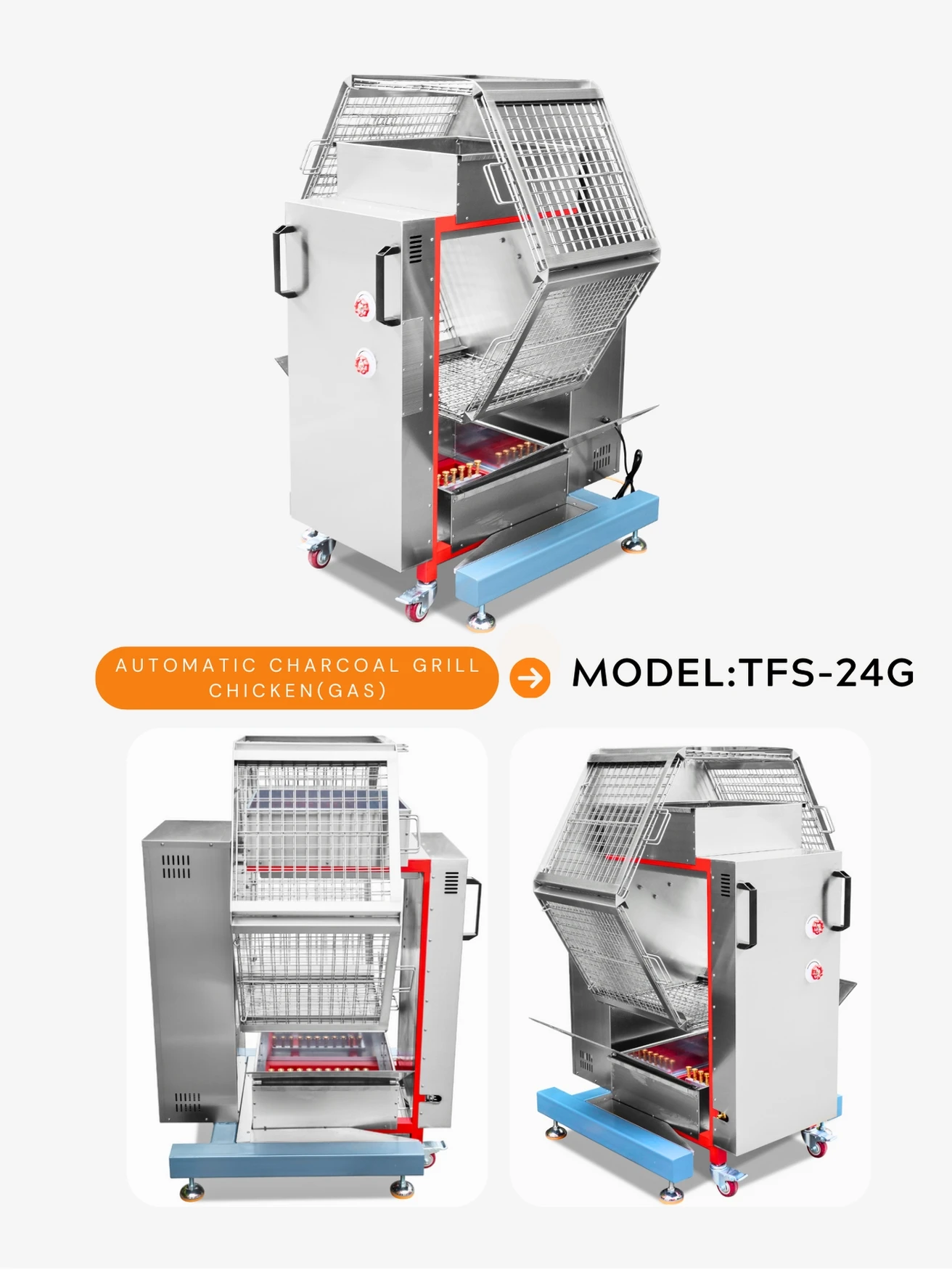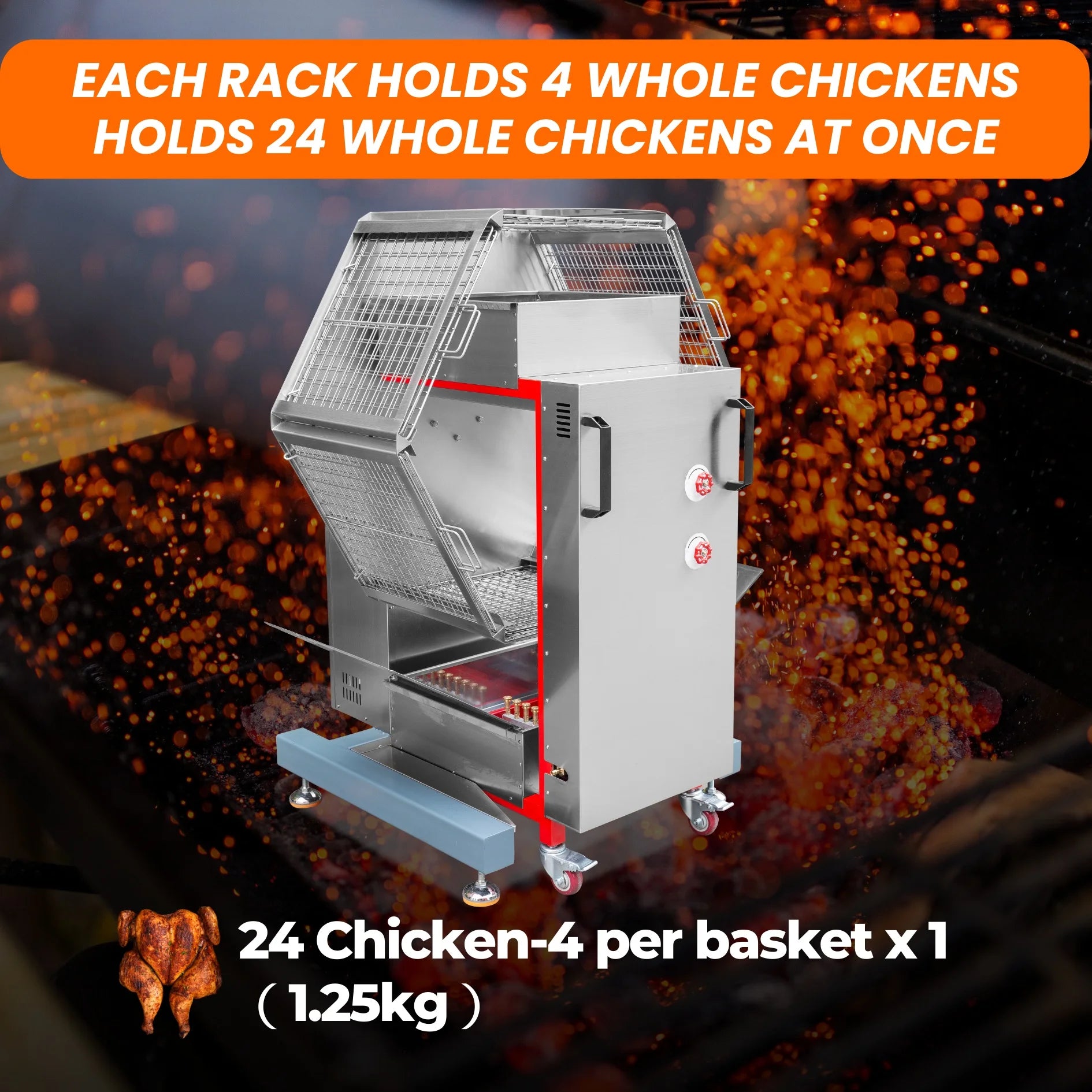 * Capacity: 24 chickens (4 per basket × 1–1.25 kg)