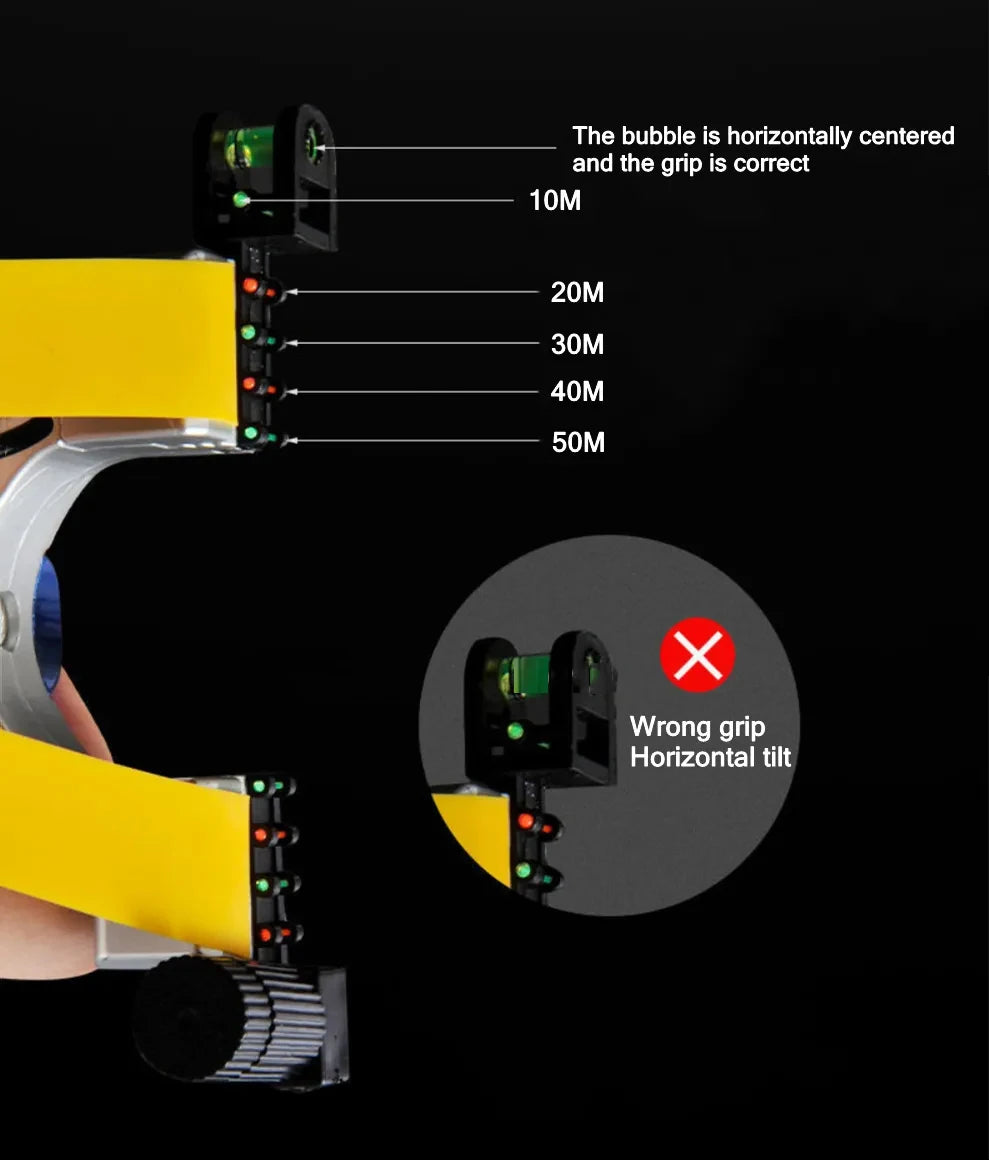 2. The slingshot adopts laser aiming + horizontal aiming, and the level allows novices to adjust the design posture.