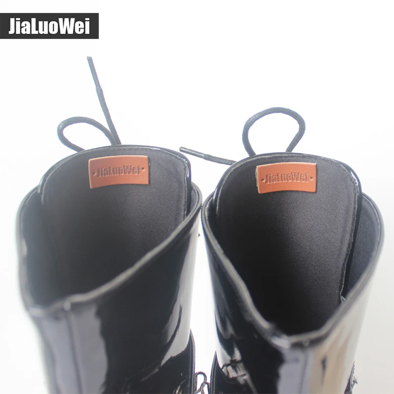 jialuowei 18CM Extreme high heel Sexy Fetish pointed-toe thin Heels motorcycle Patent Leather lace-up Lockable Ankle Strap Boots