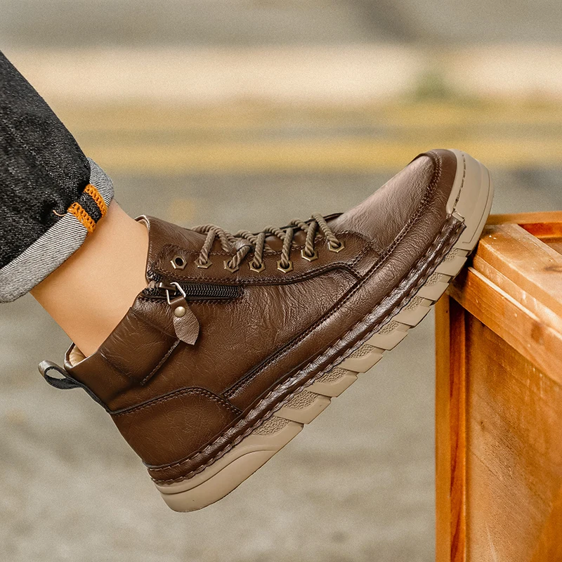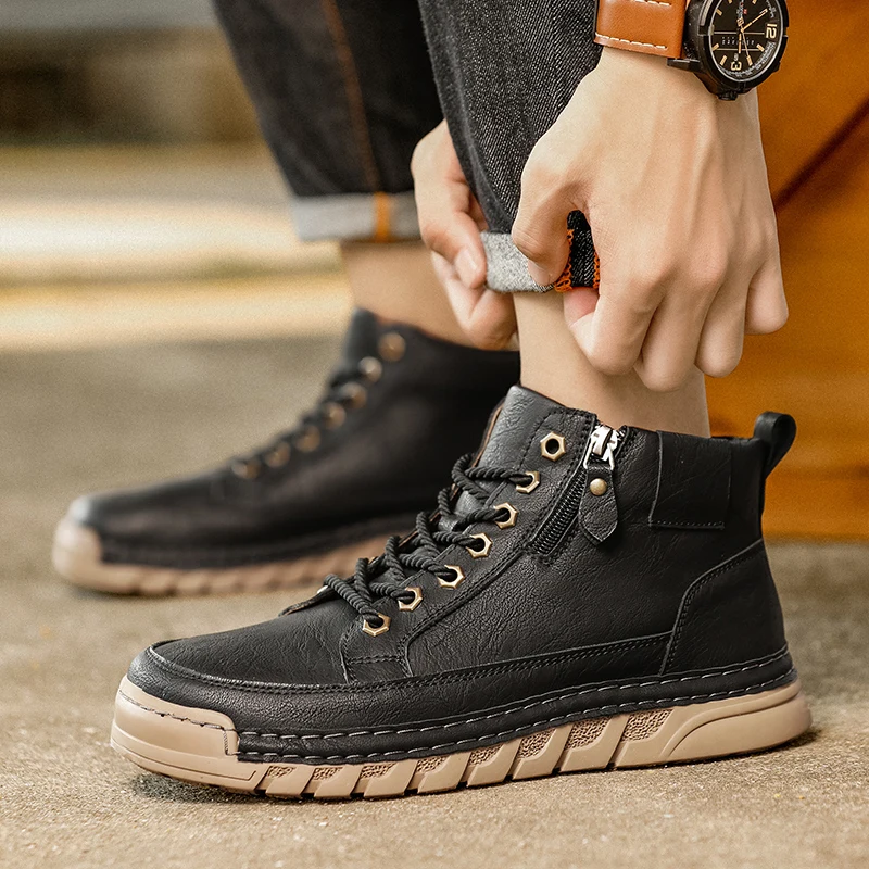 Men's High Top Leather Ankle Boots Comfortable Motorcycle Boots Non Slip Walking Training Shoes Botas Outdoor Treking Footwear