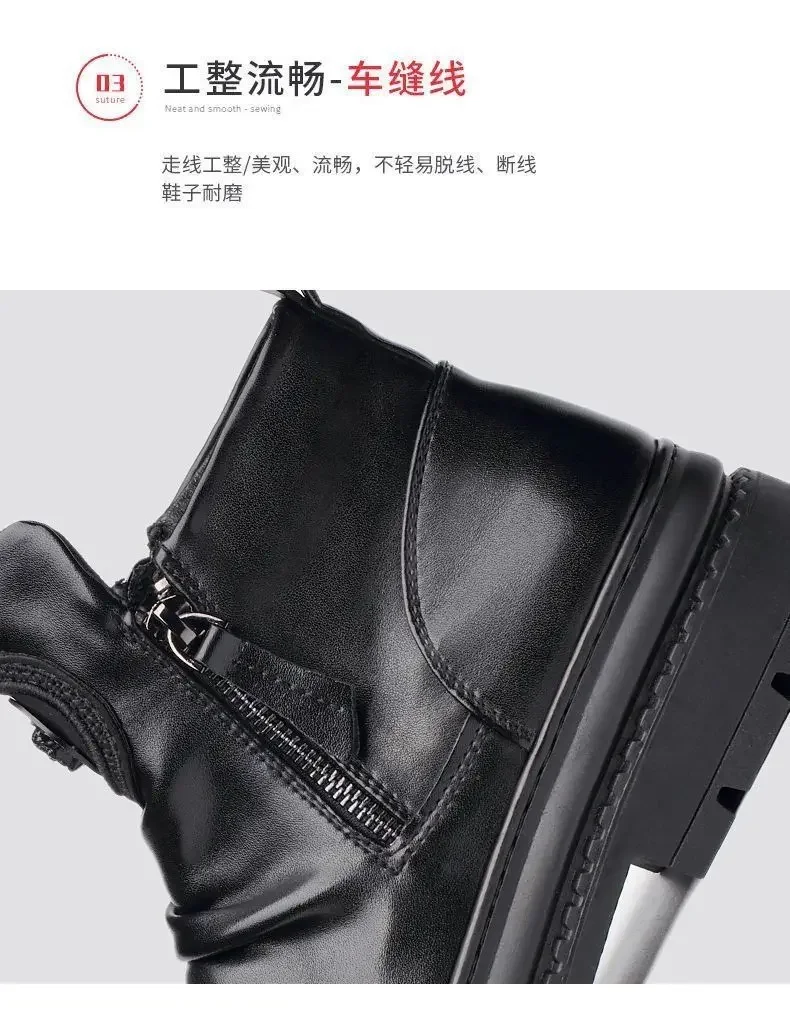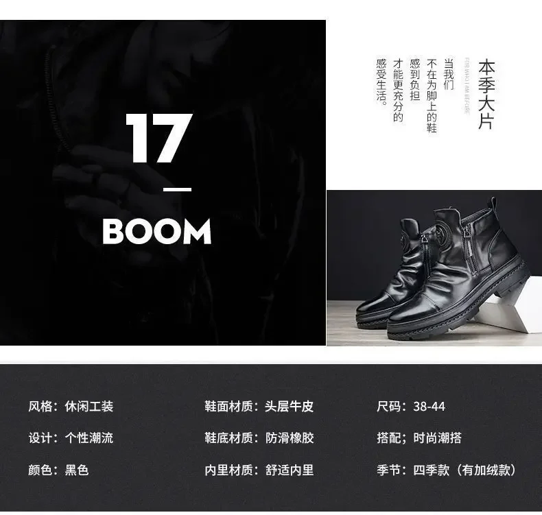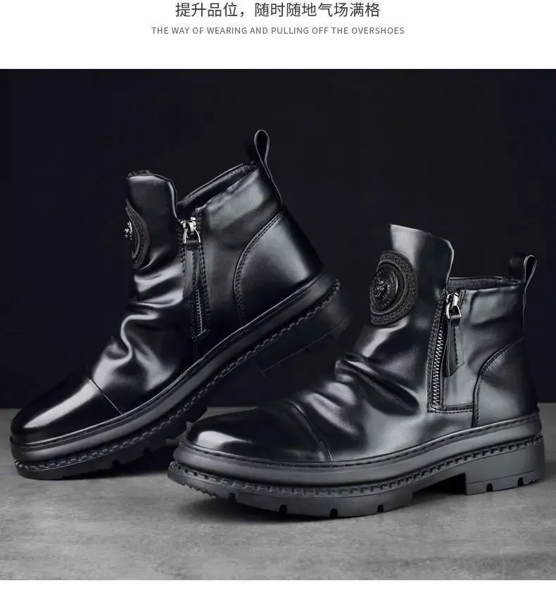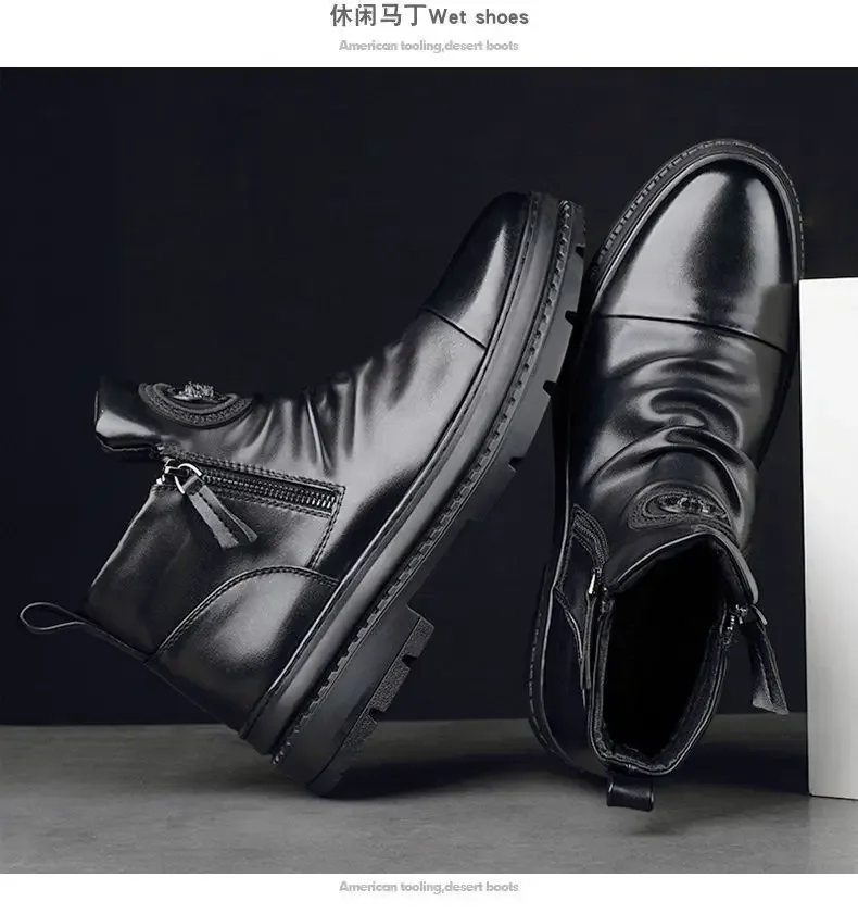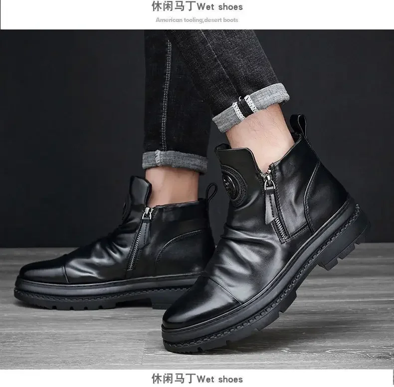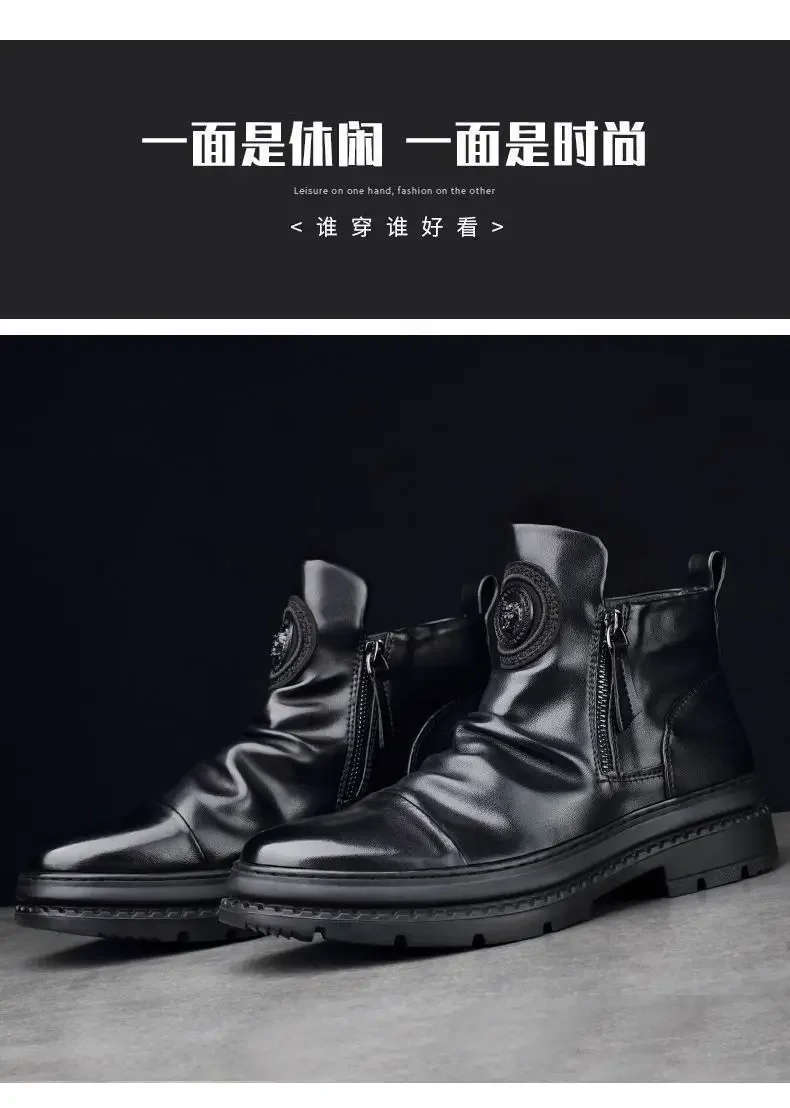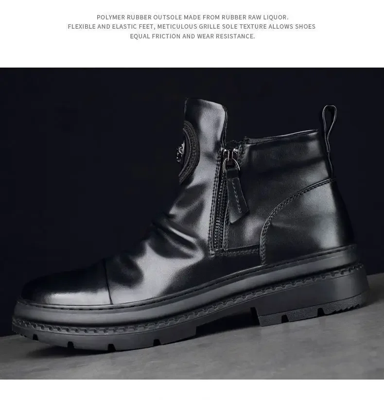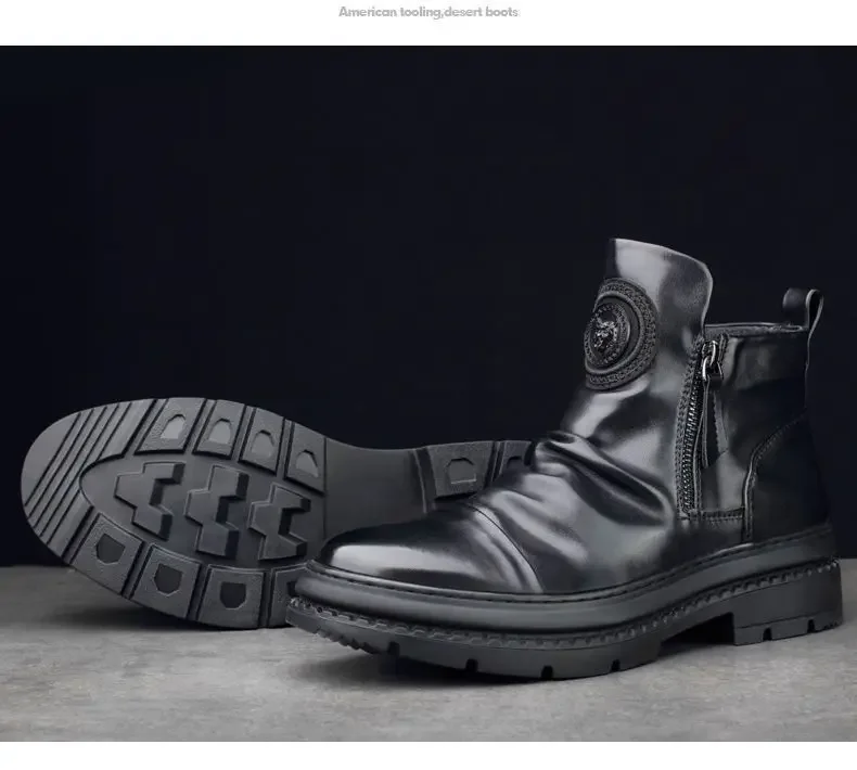 Men's Motorcycle Leather Boots British Style Round Head High Top Shoes Side Zip Walking Casual Platform Boots Bota Masculina