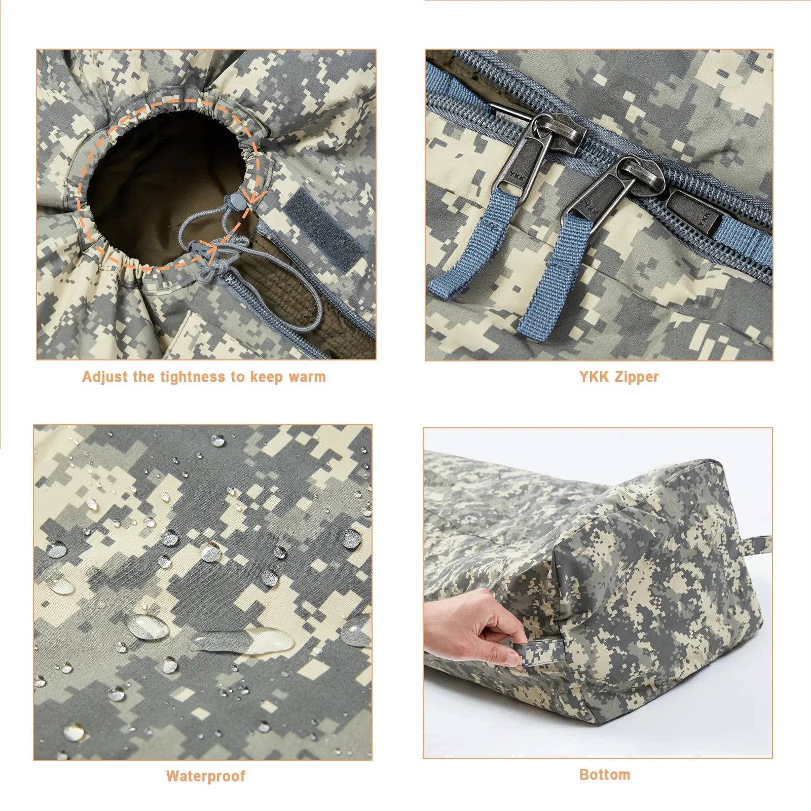 The outer fabric is made of Water-resistant and scratch-resistant high-strength nylon surface, thickened nylon tightening belt. Filling: Polarauard HV High-grade military filling material, high fluffy, compression resistant.