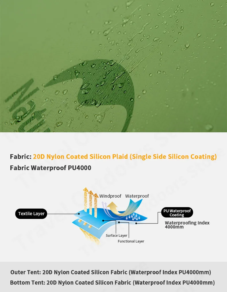 Inner Tent Material: 20D Waterproof Velvet Silk