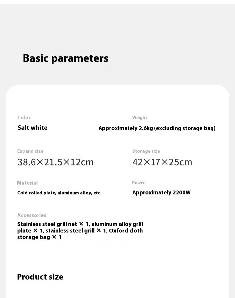 Accessories: stainless steel grill x1, aluminum alloy baking tray x1, stainless steel grill x1, Oxford cloth storage bag x1