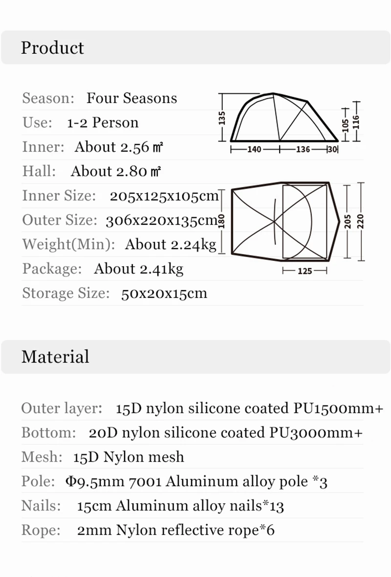Naturehike Camping Tent Ultralight Silicon Coated Outdoor 4 Season Tents Waterproof 15D Nylon Double Layer 2 Person Hiking Tent
