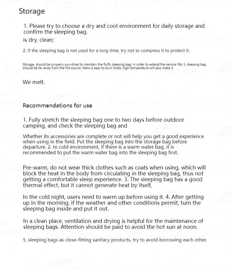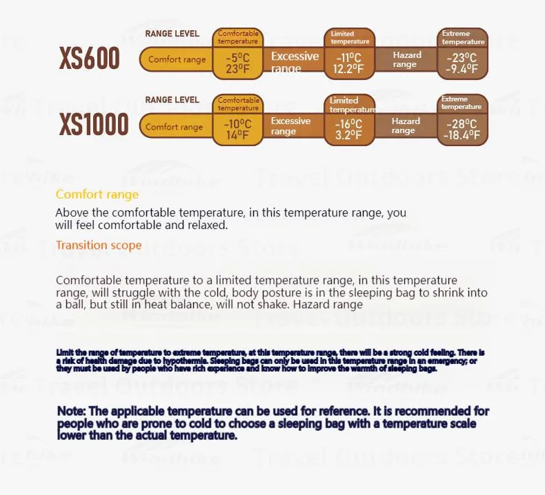 Limit The Temperature To The Extreme Temperature Range. In This Temperature Range, There Will Be a Strong Cold Feeling. There Is a Risk Of Health Damage Due To Hypothermia. Sleeping Bags Can Only Be Used In This Temperature Range In An Emergency; Or It Must Be Used By People Who Have Rich Experience And Know How To Improve The Warmth Of Sleeping Bags.