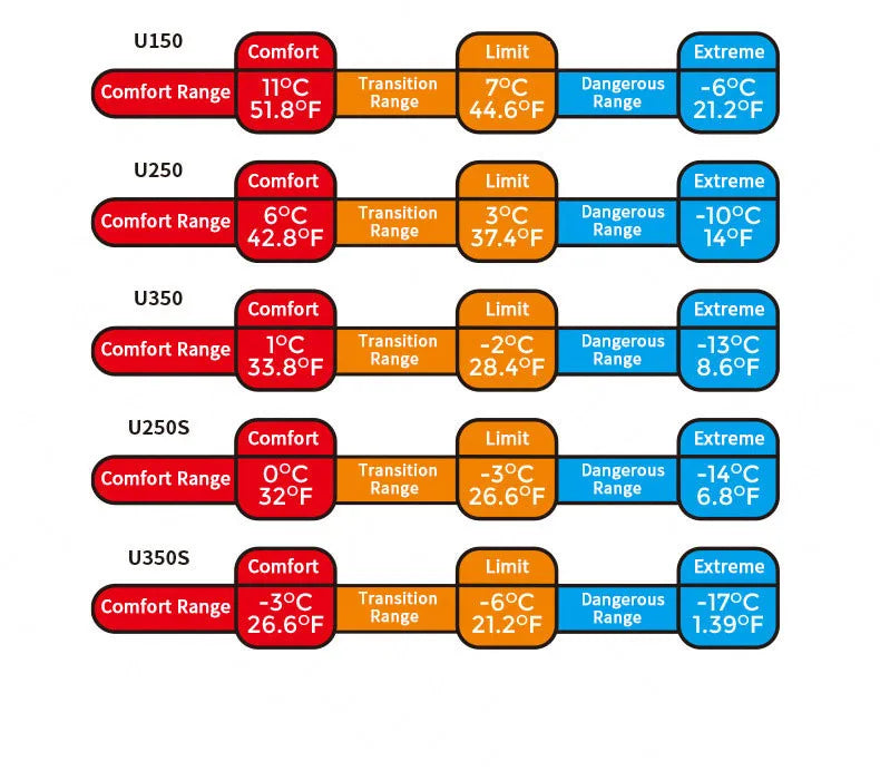 Comfort Temperature: 0℃ / 32℉(U250S) / -3℃ / 26.6℉(U350S)