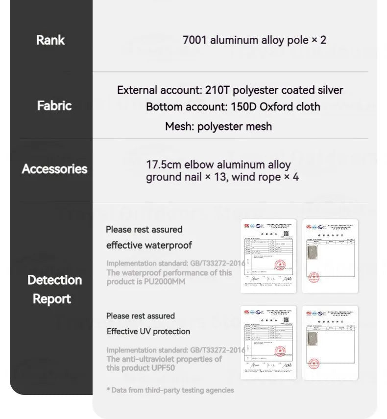Material: 7001 aluminum rod, silver coated 210T polyester, 150D oxford cloth