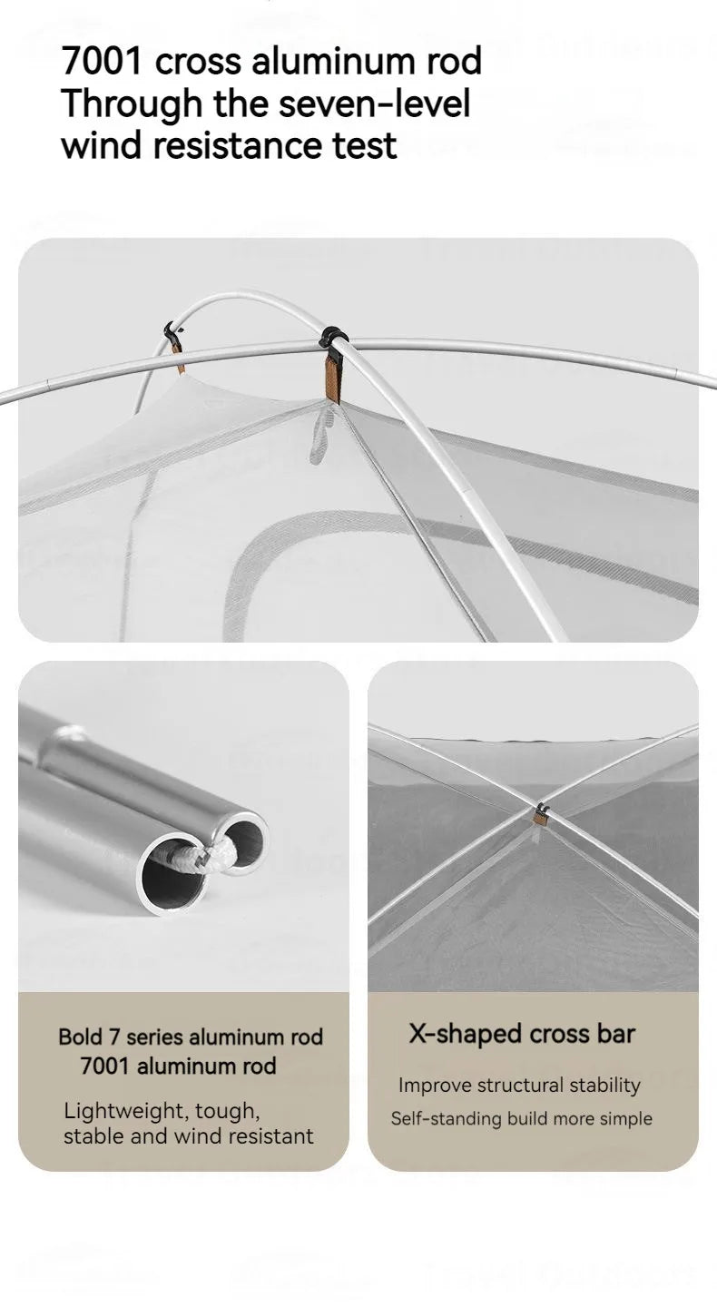 Material: Synthetic fibres,7001 aluminum rod, silver coated 210T polyester, 150D oxford cloth
